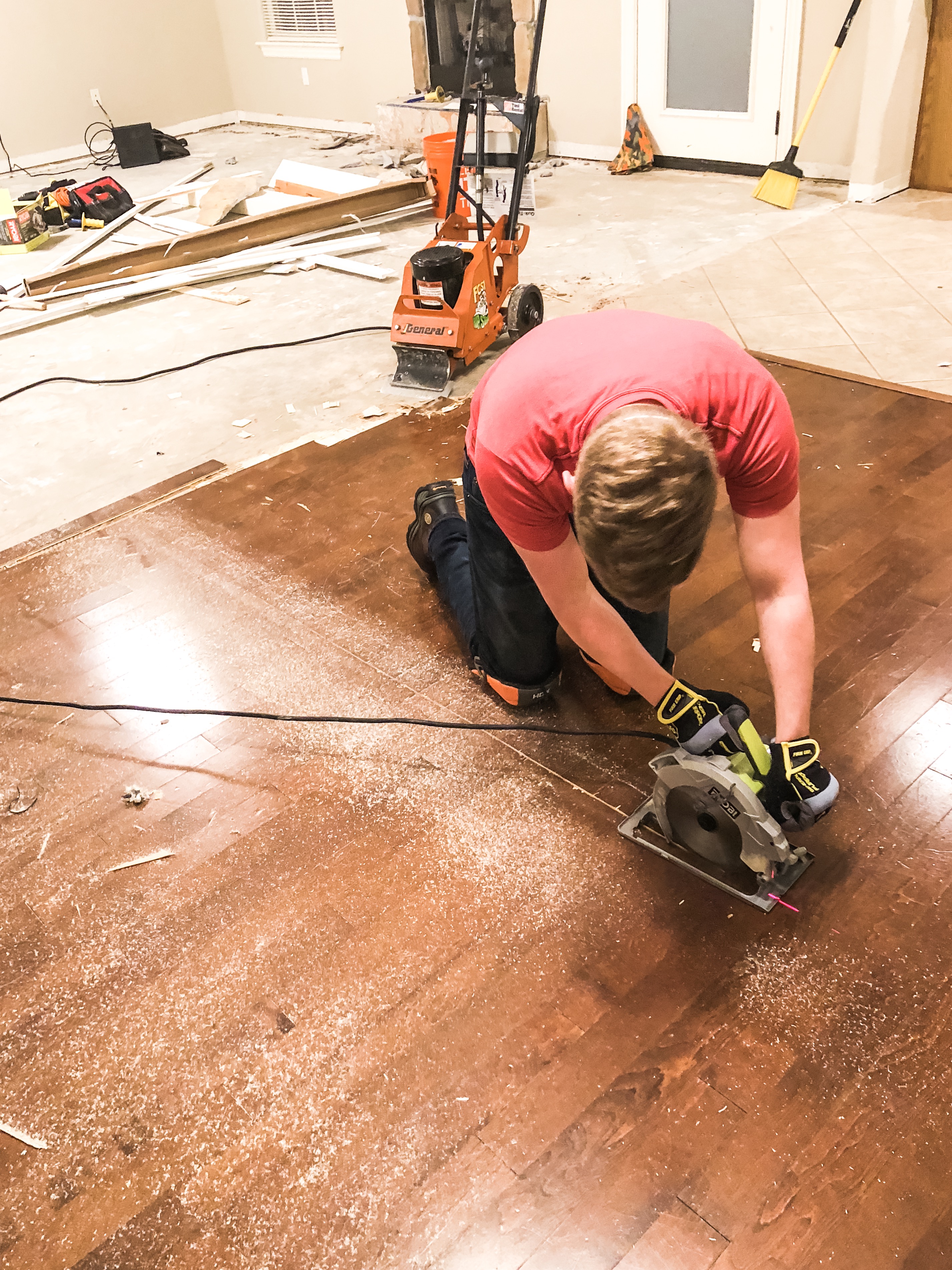 I knew the tile removal would be a dusty affair and I wanted to leave it for last, so we started on the hardwood. We rented a big machine to help us rip it up and… nothing. It chipped the edges a bit, but it was not going to get the job done. J had cut lines using our circular saw down the length of the floor to help break up the planks, but it didn’t seem to be helping. Since the big machine wasn’t doing the trick, we decided to try it by hand. Off to Home Depot we went where we got a couple of mallets and chisels.