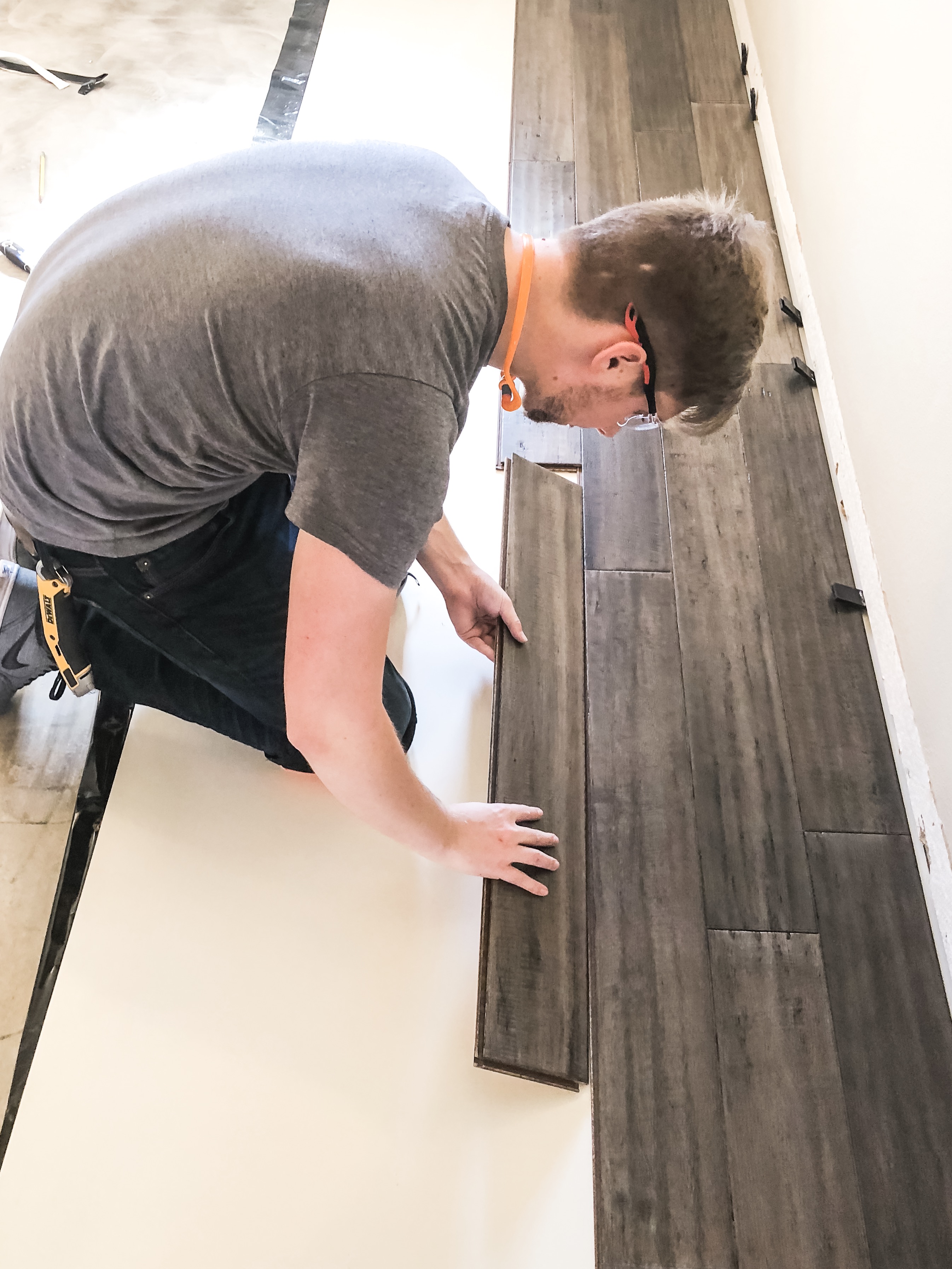 Ok, back to the floors! If you know anything about me, you know it takes me approximately 1.6 million years to make a decision. I don’t like to pick anything out until I’m sure that it is exactly what I want. Shopping for hardwood floors was no different. I knew we wanted a floating floor because it would be easy to install and this was, quite literally, my first renovation project. J and I looked for months and months and then finally, we found the one. A hand scraped, warm gray, medium tone bamboo flooring. It is so beautiful!