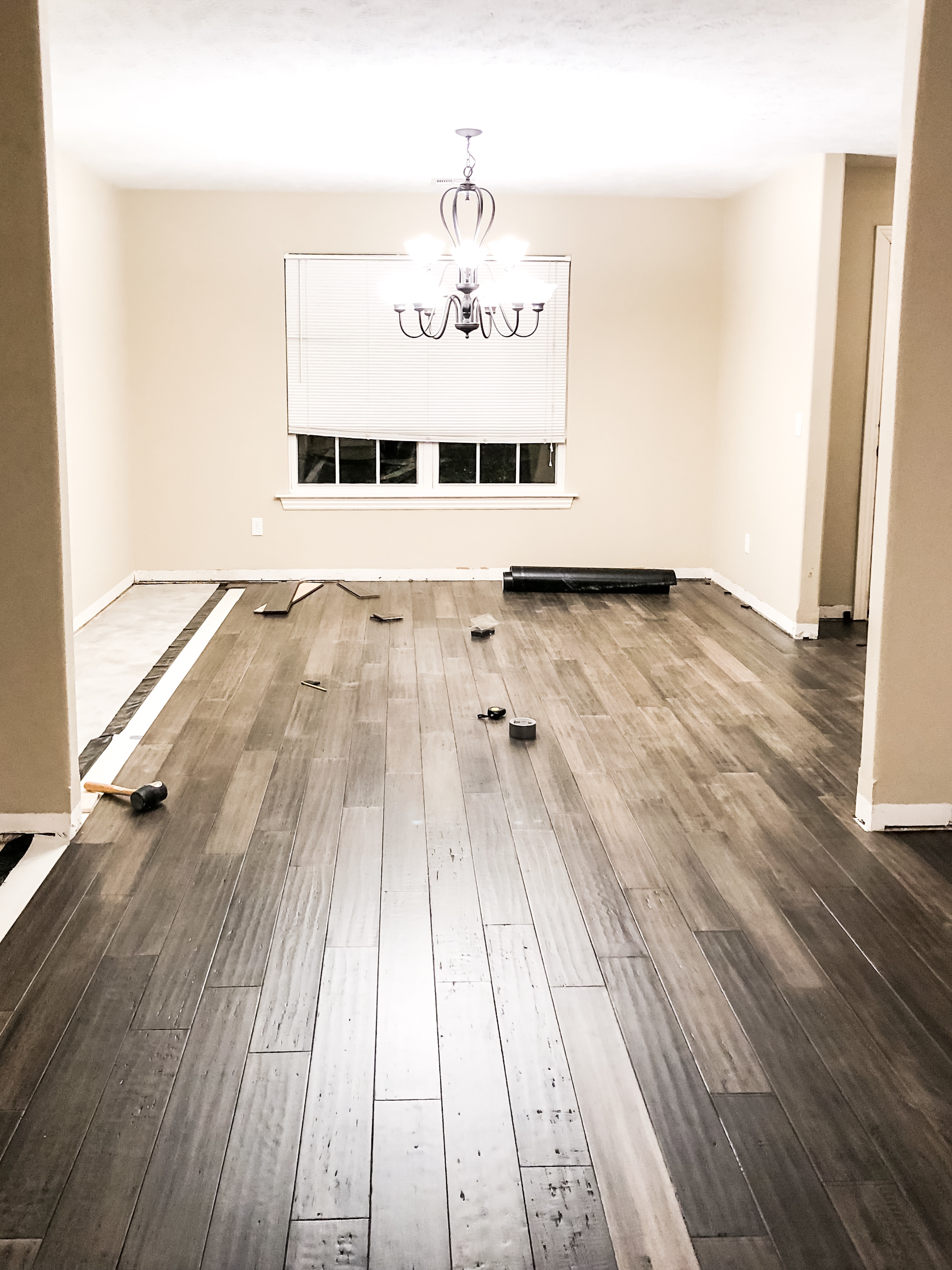 J did not start up at his new job until 2 weeks after we moved, so we used that as our deadline of when we wanted to be finished. After demo, we had about a week left and we worked every day to get the floor laid (we covered just about 1,100 square feet).