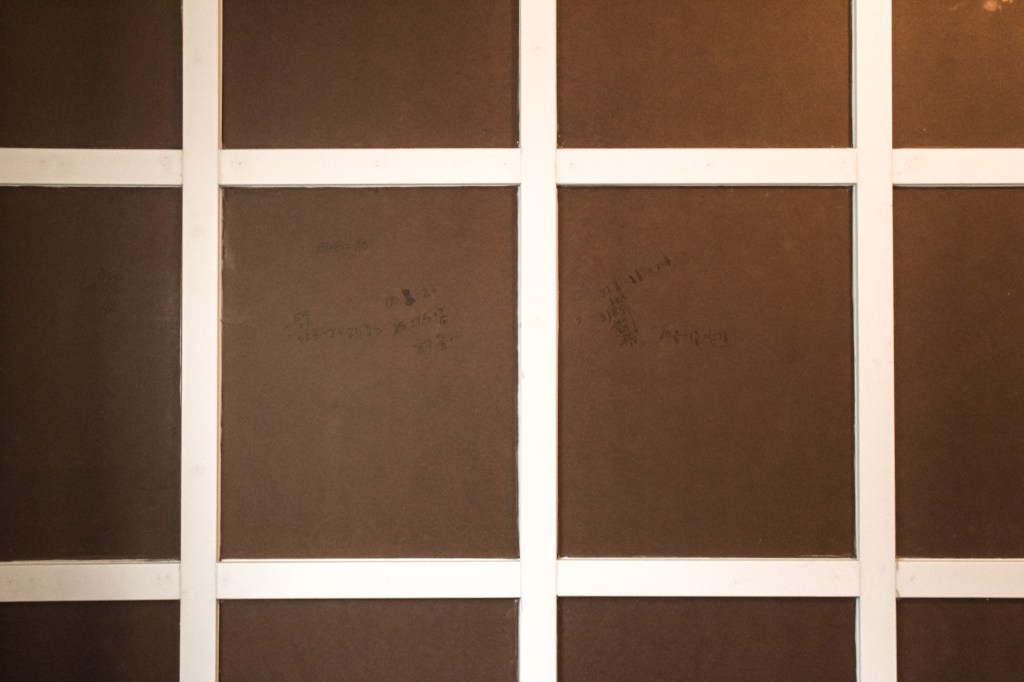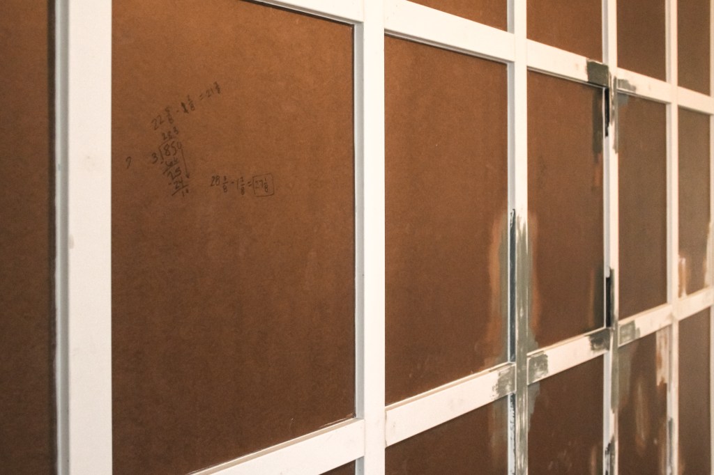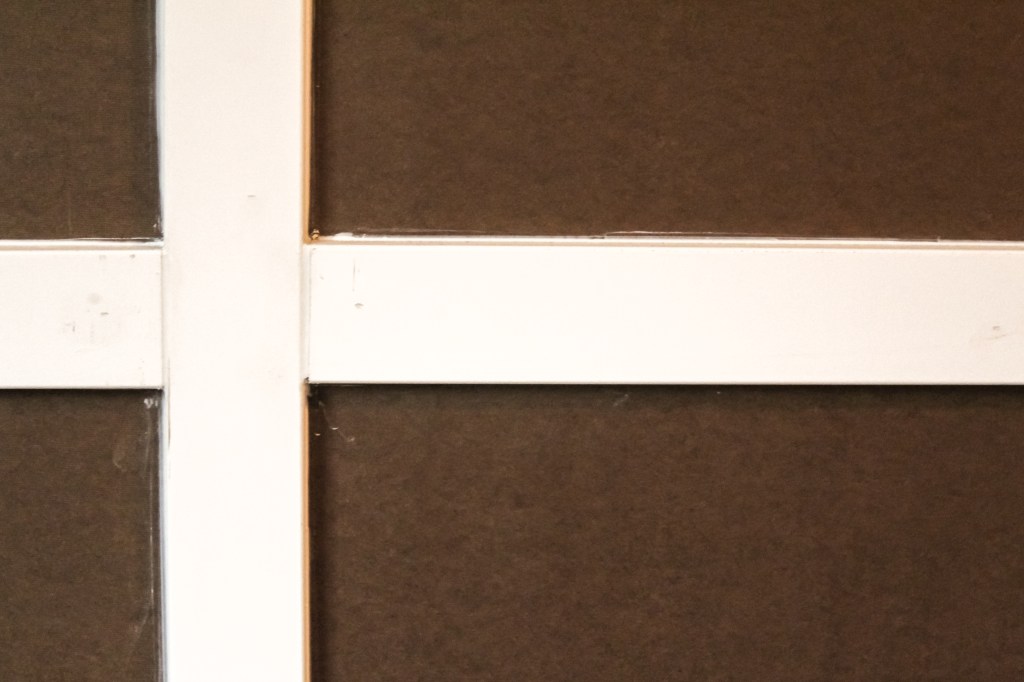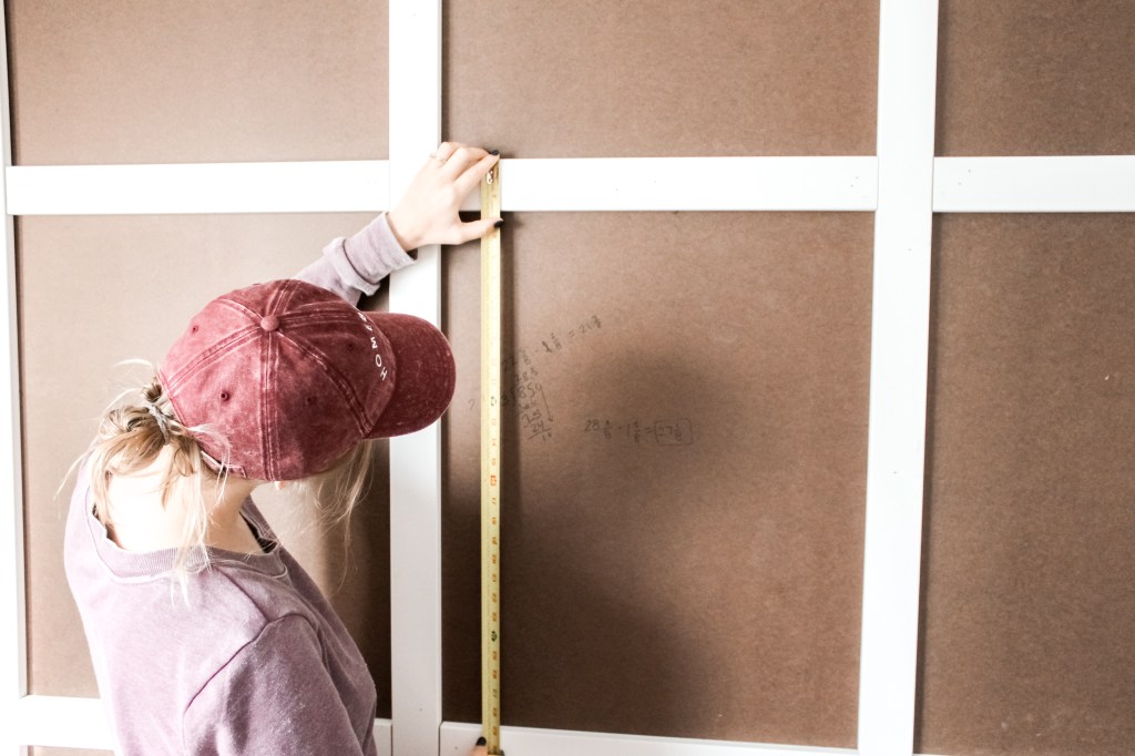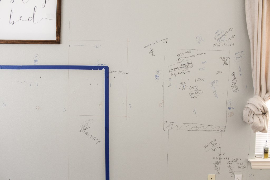 It took me forever and a day (okay, maybe more like 2ish hours) to figure out where everything was going to go. I taped off where my bed will sit so that I could visualize it and then estimated how big I wanted my rectangles to be. I wanted the rectangles to fall well against the window and the bed. II measured how long my wall was (don’t forget to account for the two pieces of MDF you’ll attach to each corner) and figured out a width per rectangle that allowed for a full rectangle on each side, but I marked it out and didn’t like the way it fell around the window. Instead, I opted for the last column of rectangles to be a little bit smaller because it’ll be hidden by curtains anyway.