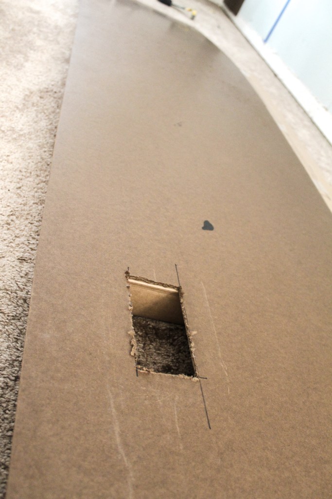 There were two outlets that I needed to cut around. I measured where the outlet fell and traced it onto my panel. Using a drill, I made a hole in the corner big enough for my jigsaw blade to slip into and then used the jigsaw to cut it out.