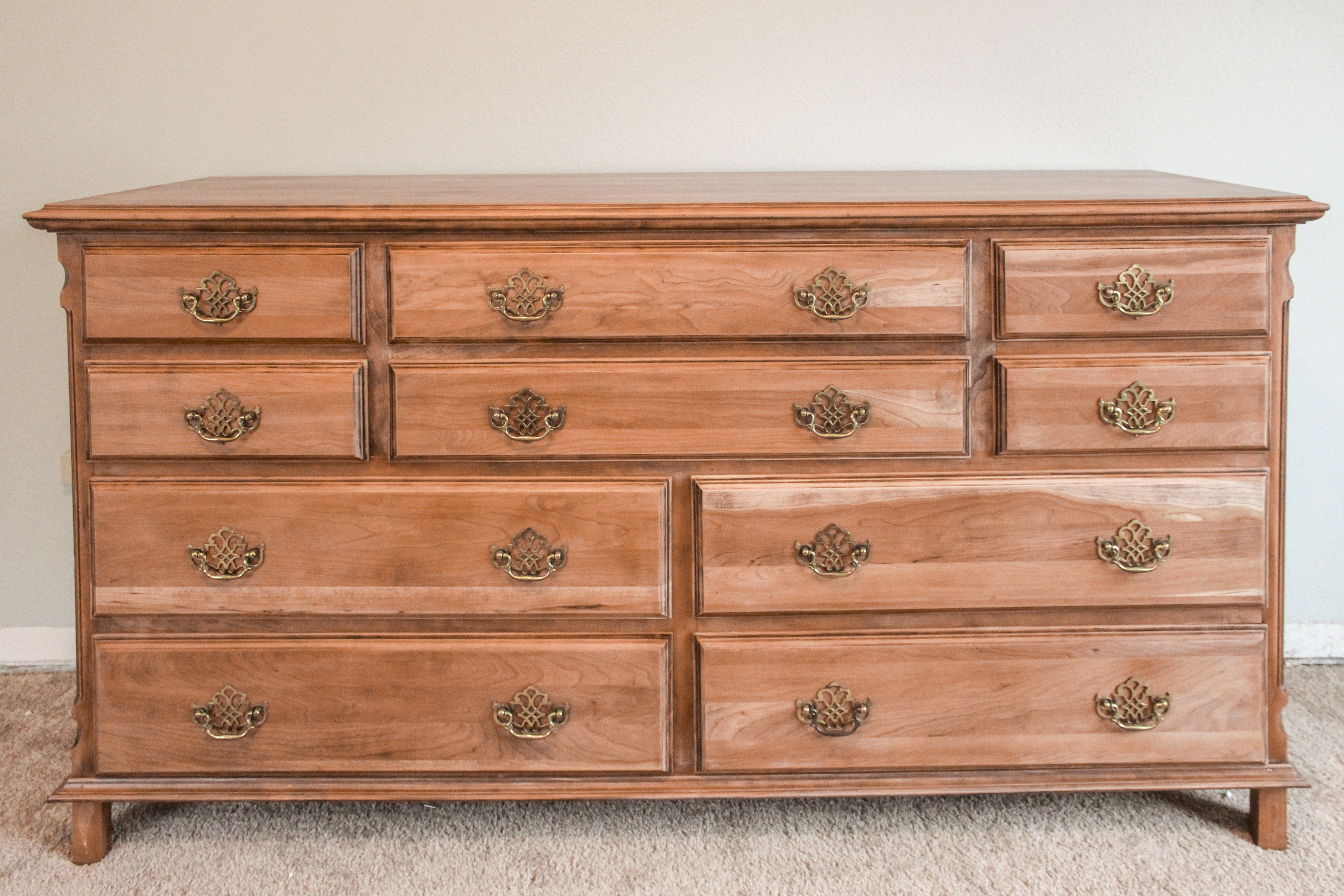 I got an idea of what I wanted (which was classic looking with light wood) and everything I could find was out of my budget. Remember that part of me didn’t want a dresser, so I couldn’t justify spending a ton of money on one. I began to search on Facebook Marketplace for something that I could refinish (I’ve been planning to refinish our dining room table for quite some time, so I had already done the research and new what I was committing myself to). When I read that the only reason this particular piece was for sale was that it was so heavy the seller didn’t want to move it, I knew I had found the one! It’s a solid item that I could turn into exactly what I was looking for.