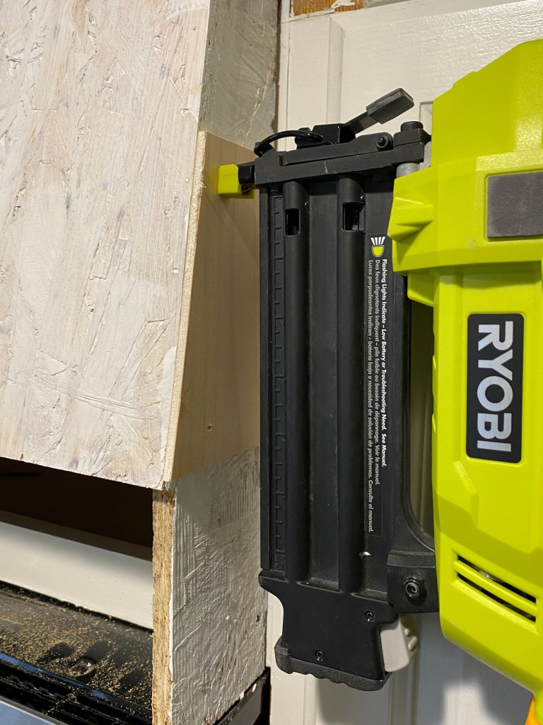 Measure the length of the hypotenuse of the triangle you just cut and the distance from outside edge to outside edge of your side pieces. Cut a piece of OSB that matches these dimensions. Lay it on top of your side pieces (making sure the bottom is level) and attach it to the side pieces with the nail gun.
