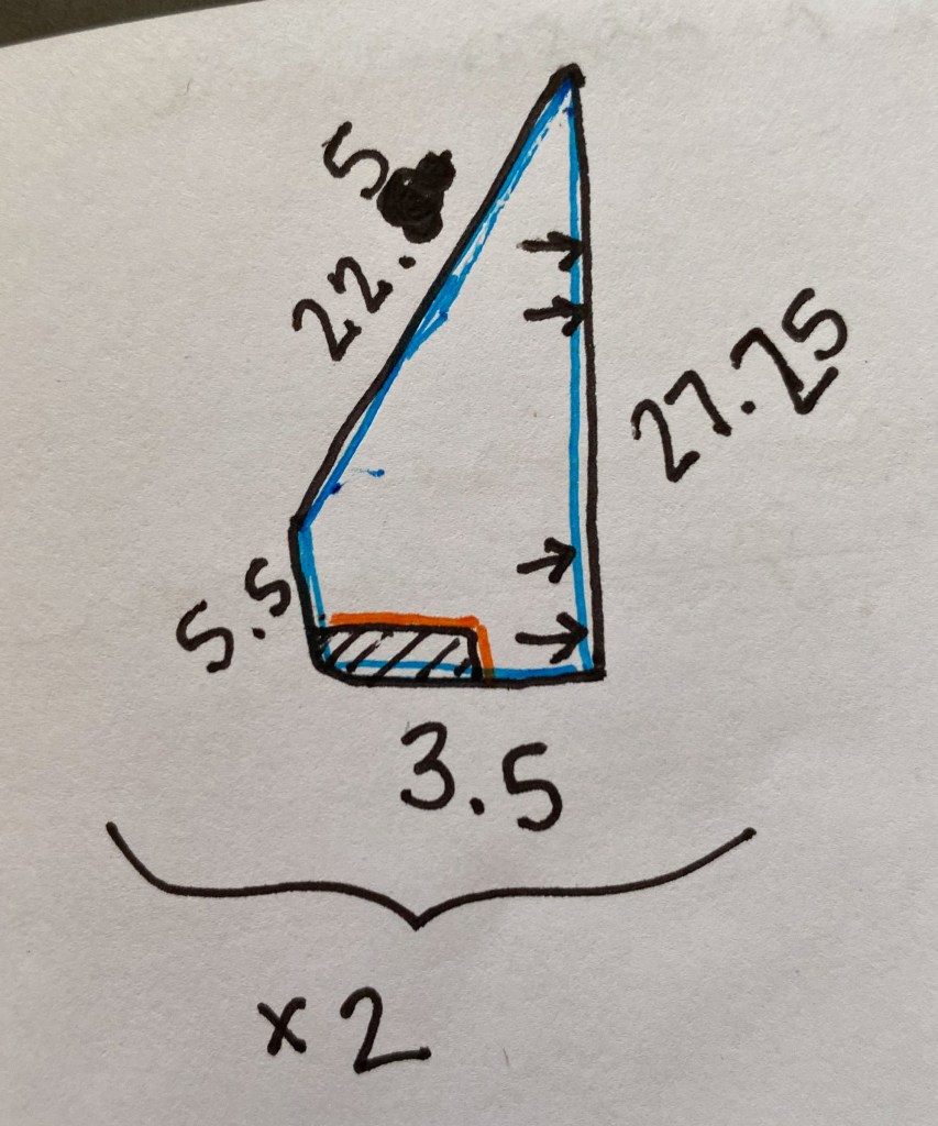 Now you need to cut your OSB. Measure the distance from the top of your microwave to the ceiling (minus 1″) and the distance that your microwave sticks out (minus 3/4″). You’re going to cut out a long triangle with a rectangle on the bottom. Mark the height of your hood first, then measure 5 1/2″ up from the bottom of that and make another mark. Mark the depth measurement at the 5 1/2″ spot as well as at the bottom of your height measurement. Draw a line between the corner of the OSB and that mark (5 1/2″ up, x” deep) to create your triangle. Draw a straight line between the two depth marks and from the bottom depth mark to the edge of the OSB to create your rectangle. Now, cut along these lines using the circular saw. This doesn’t need to be perfect because it will be covered with shiplap, but try to keep it as straight as possible (this cut is outlined in blue below). Repeat this process for the second side.