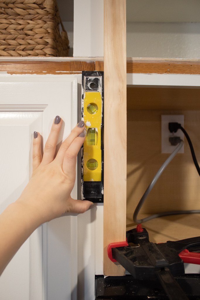 Once that is hung, measure the distance from the cabinet to the outside of the 1×6. this is the outside length of your side piece. Make sure to measure each side independently in case they are slightly different. Cut your pieces with a mitered corner to line up with the front piece. The other side should be flat to butt up against the cabinet. Test your fit before attaching them and once you are satisfied, glue one side on and clamp it overnight. Repeat with the other side.