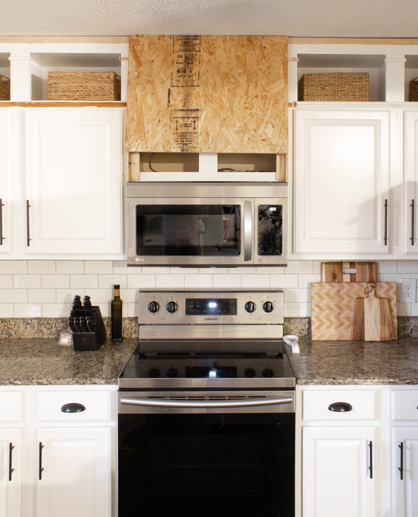 Over a year ago, I built our kitchen cabinets up to the ceiling and added these cute cubbies to one wall. While I love the side ones that I’ve put baskets in, the middle one has had me stumped. I can’t seem to style it in a way that I like without it feeling cluttered to me. I had the idea of building a faux vent hood over the microwave and so off to Pinterest I went! I found this from Holly over at Our Faux Farmhouse and while I didn’t want that exact style, it confirmed to me that I could make it and it wouldn’t look weird.