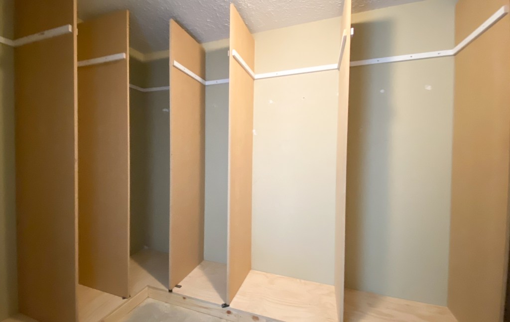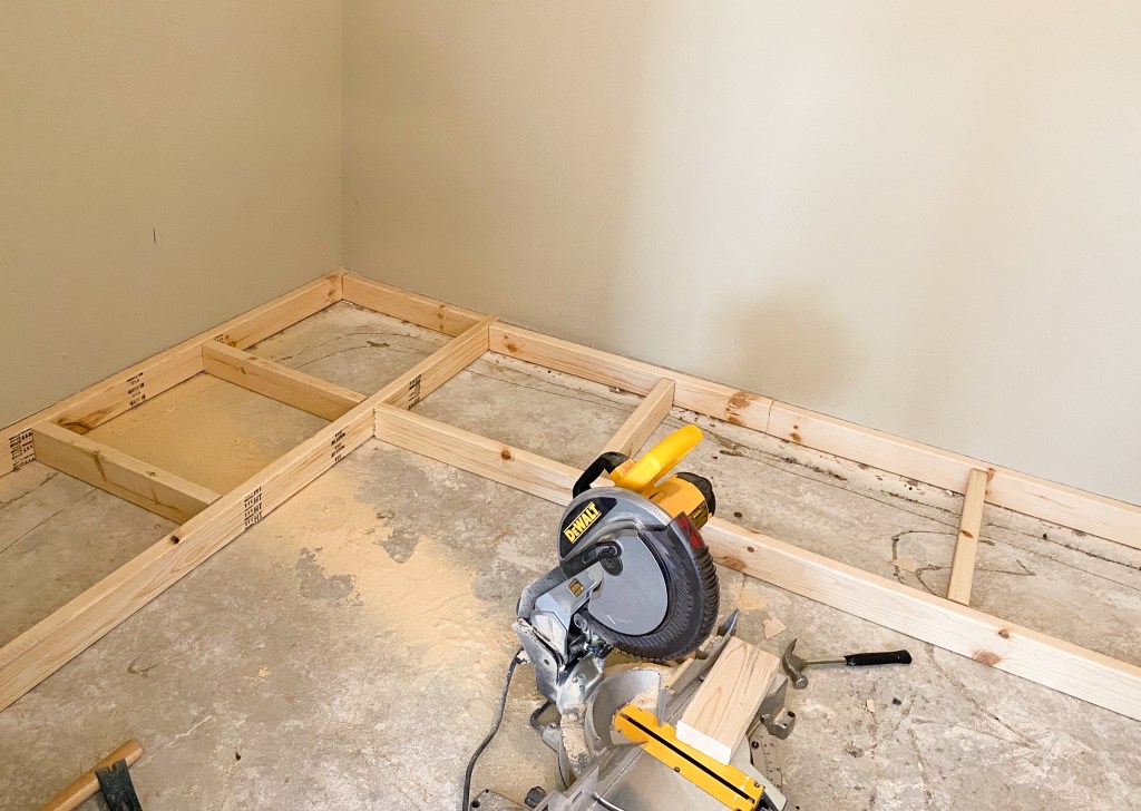 With a clean slate, I could start the build! First, I built a base out of 2x4s. Basically, I constructed a box and then screwed it into the studs. I also made sure that there was a 2×4 running under where every divider would go.