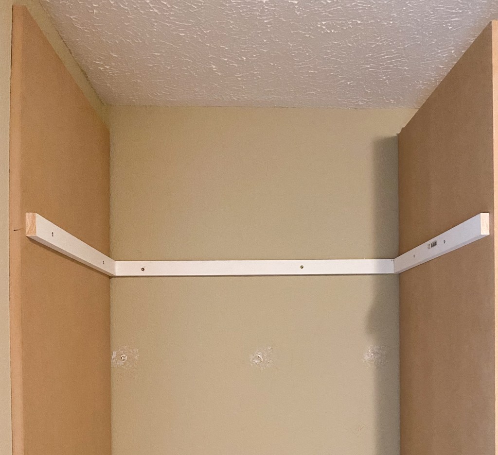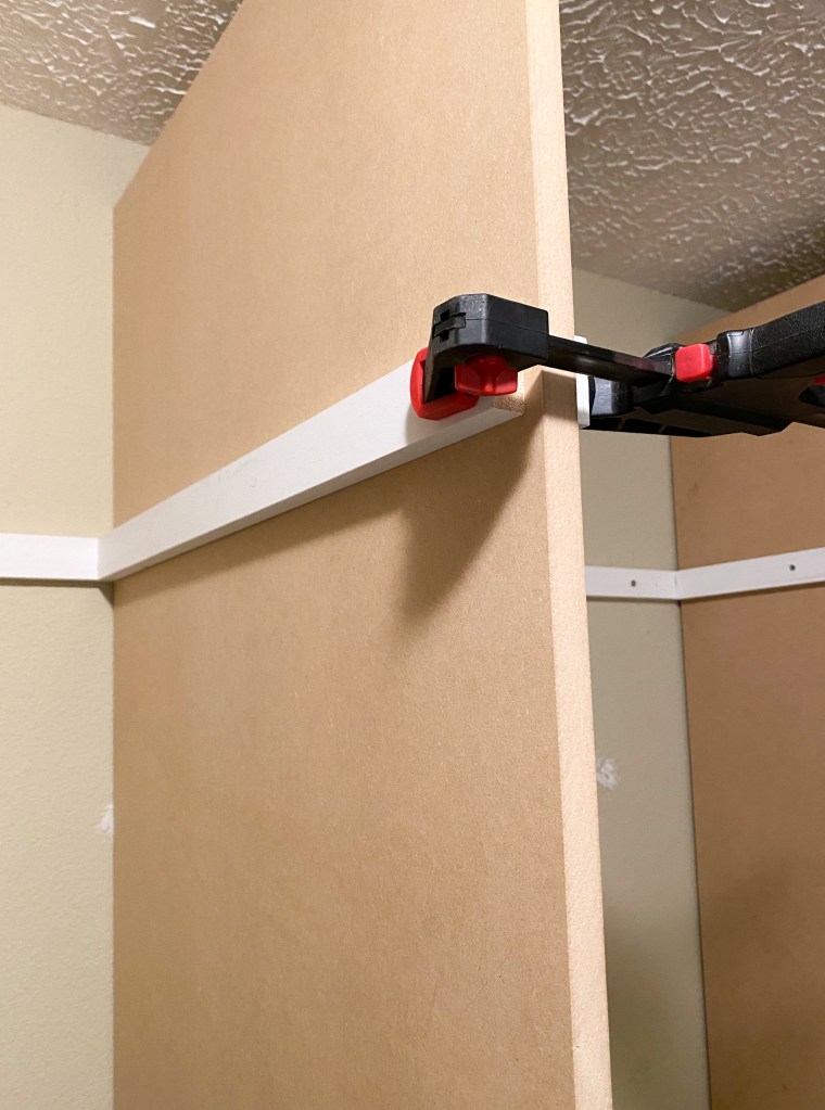 Next I needed to build supports for the dividers. I did this as I went, so that my measurements could be really precise. I used 1×2 pre primed pine and cut one piece to the width of my closet section (the back piece) then I cut two side pieces to 22.25″. Since my built ins are 23.5″ deep, this accounted for the width of the 1×2 that I attached it to and enough space for trim on the front.