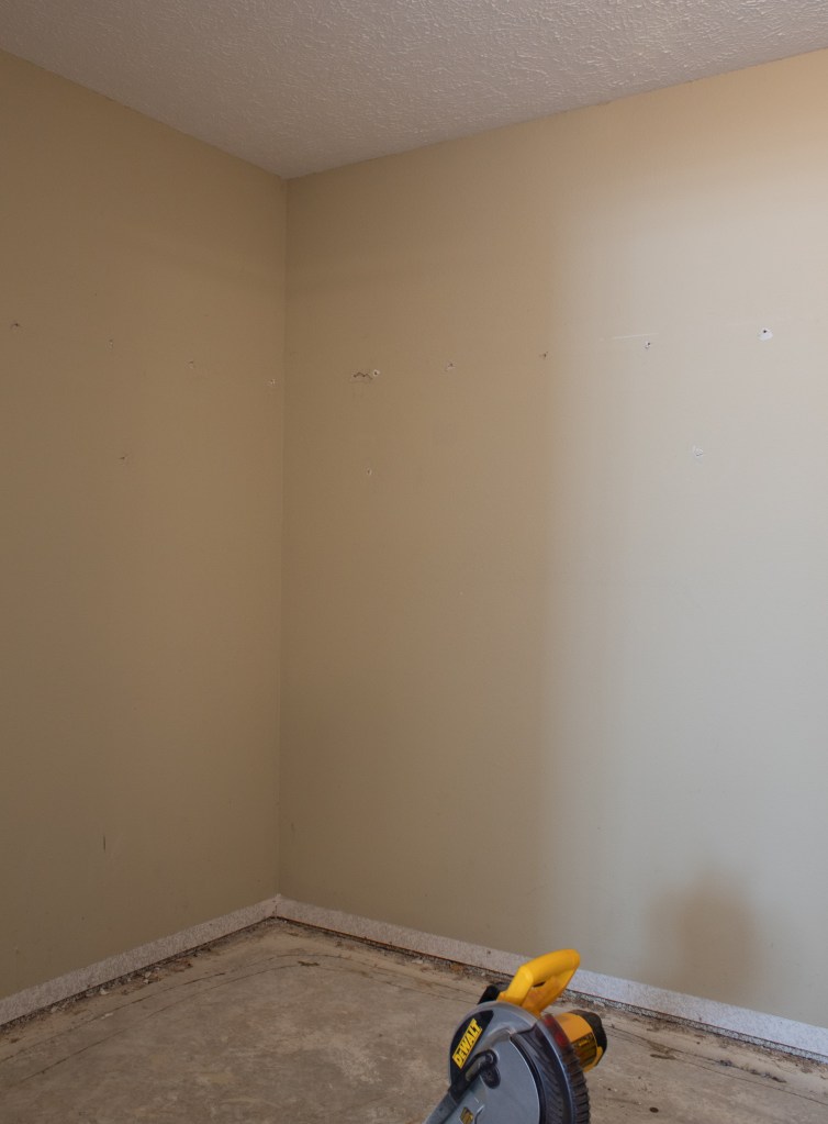 Now that everything was planned, it was time for demo! My mom was in town and in just a couple hours, we cleared everything out of the closet, moved it into the guest room closet, ripped out the old wire shelving, and tore up the carpet.