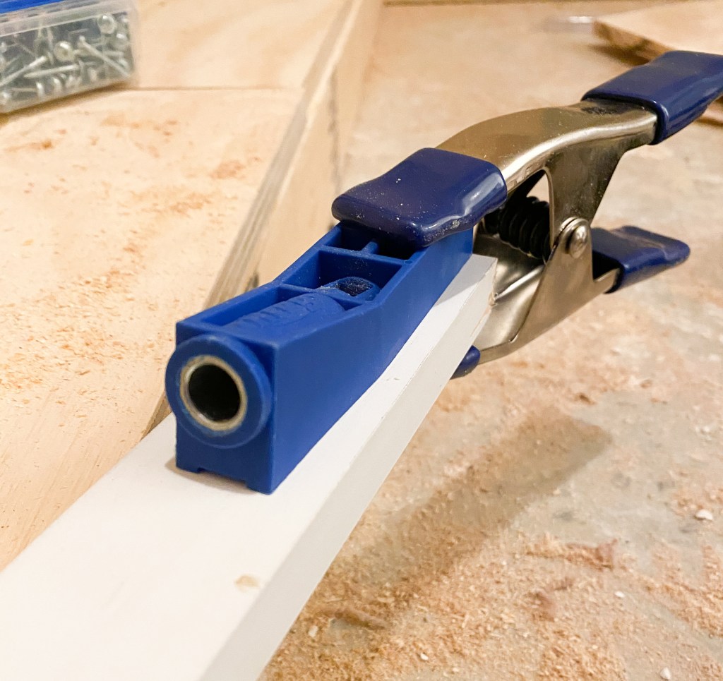 I drilled pocket holes into one end of each of my side pieces, added a little bit of wood glue, and screwed them onto the back piece. I love this Kreg jig because it makes pocket holes so easy! They also make a fancier one that makes it even easier (which, if you’re going to be doing a lot of DIY is probably worth the investment), but this less expensive one has worked well for me so far. You do need to use the special pocket hole screws for this part.
