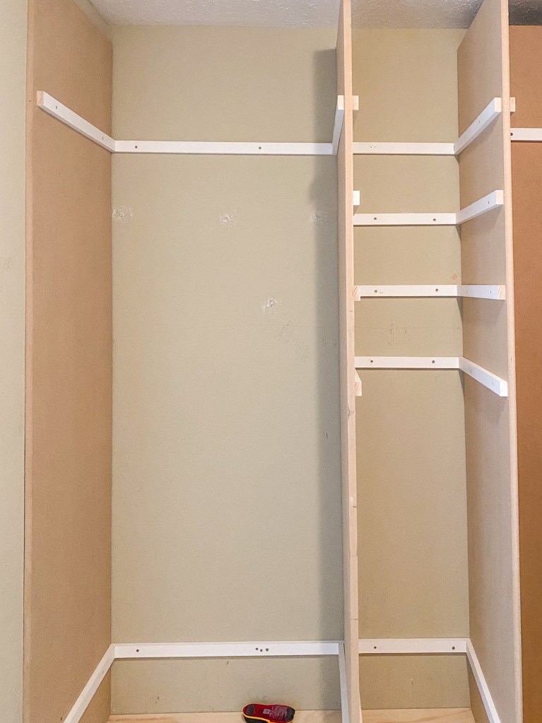 Adding the brackets may not seem like a big step, but it takes a lot of work. So much cutting and clamping and pocket hole drilling and leveling and fastening with screws goes into each one… it’s a big task. So getting all of this done was a huge win. It also meant I could finally move my miter saw back into the garage where it belongs (okay, J moved it back for me because it’s heavy and I’m a wimp) and I no longer need to barricade my closet off from my toddler. I used 1×2 pre-primed pine to build these, and I talk more about how I did that in part one of the closet project.