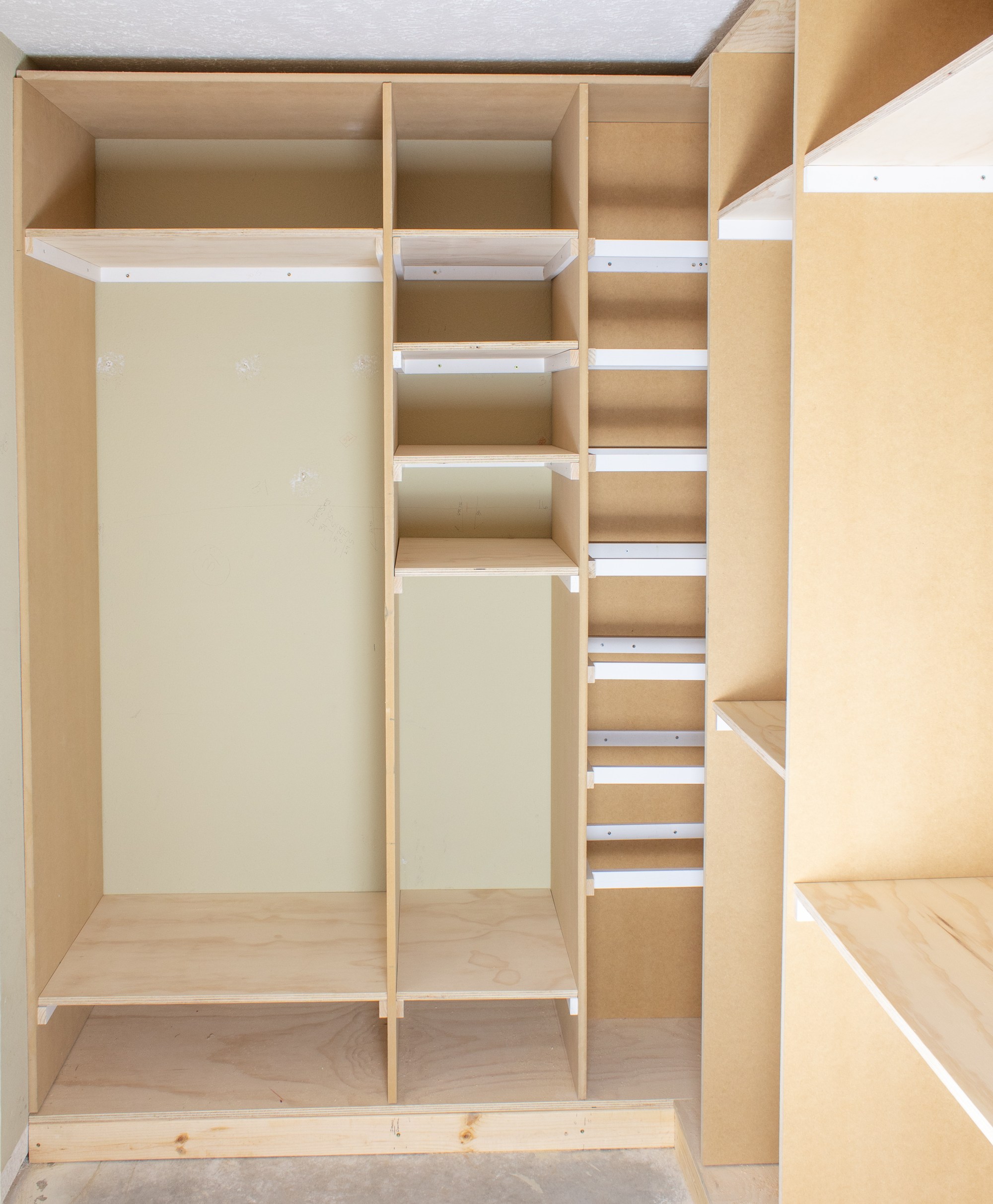 Adding the brackets may not seem like a big step, but it takes a lot of work. So much cutting and clamping and pocket hole drilling and leveling and fastening with screws goes into each one… it’s a big task. So getting all of this done was a huge win. It also meant I could finally move my miter saw back into the garage where it belongs (okay, J moved it back for me because it’s heavy and I’m a wimp) and I no longer need to barricade my closet off from my toddler. I used 1×2 pre-primed pine to build these, and I talk more about how I did that in part one of the closet project.