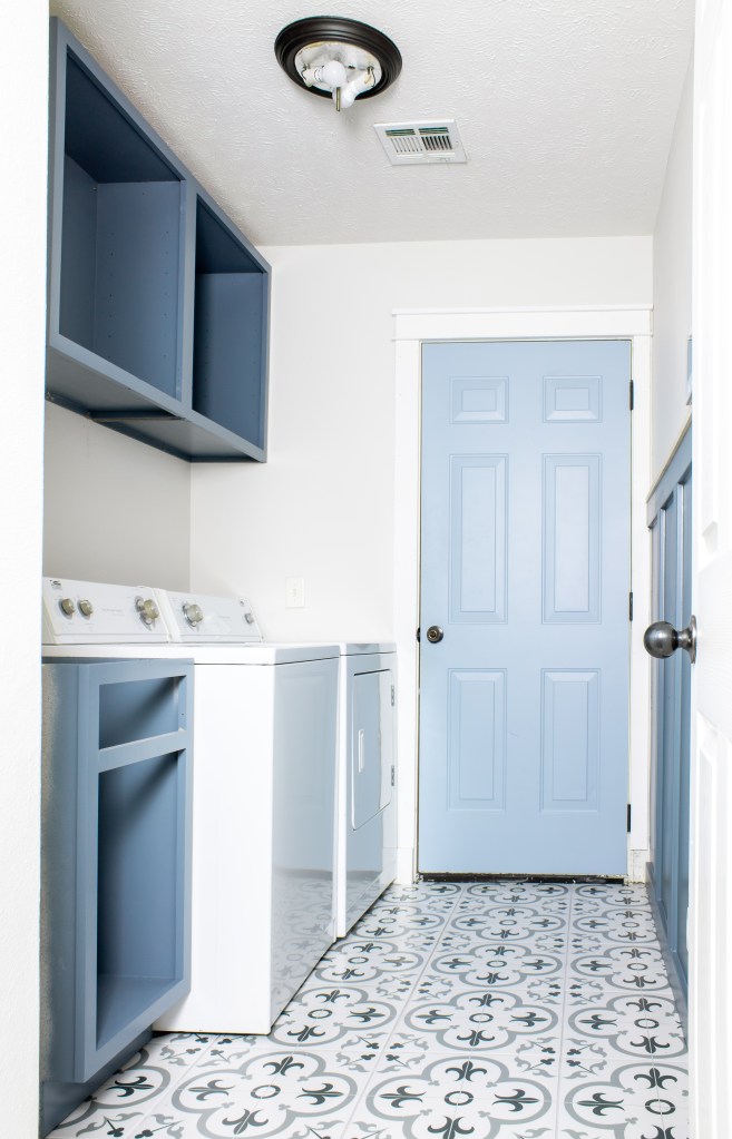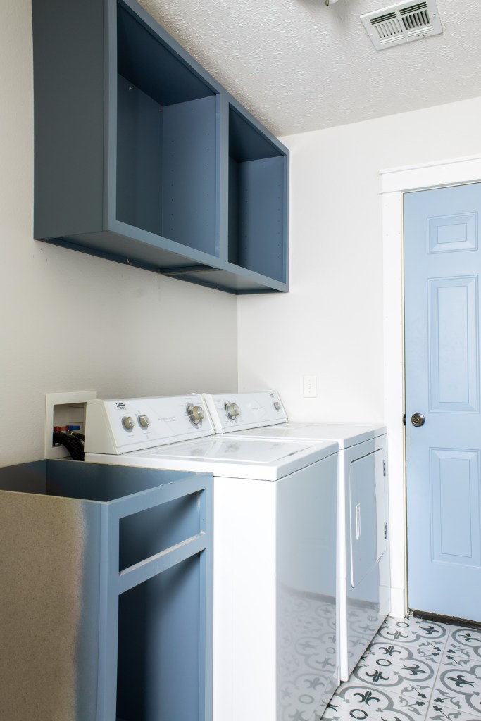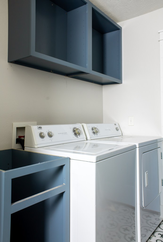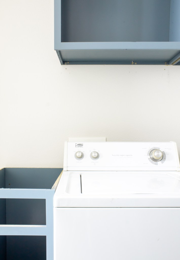 The whole purpose of this laundry room makeover is to add some storage to this space, and it’s happening! Our house has one coat closet and then a closet in each bedroom, so storage space isn’t exactly in abundance over here.
