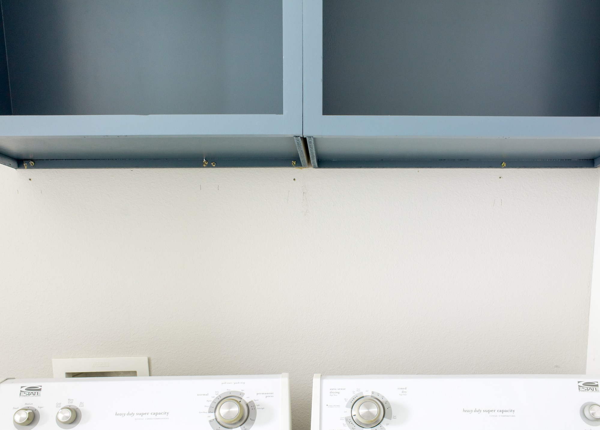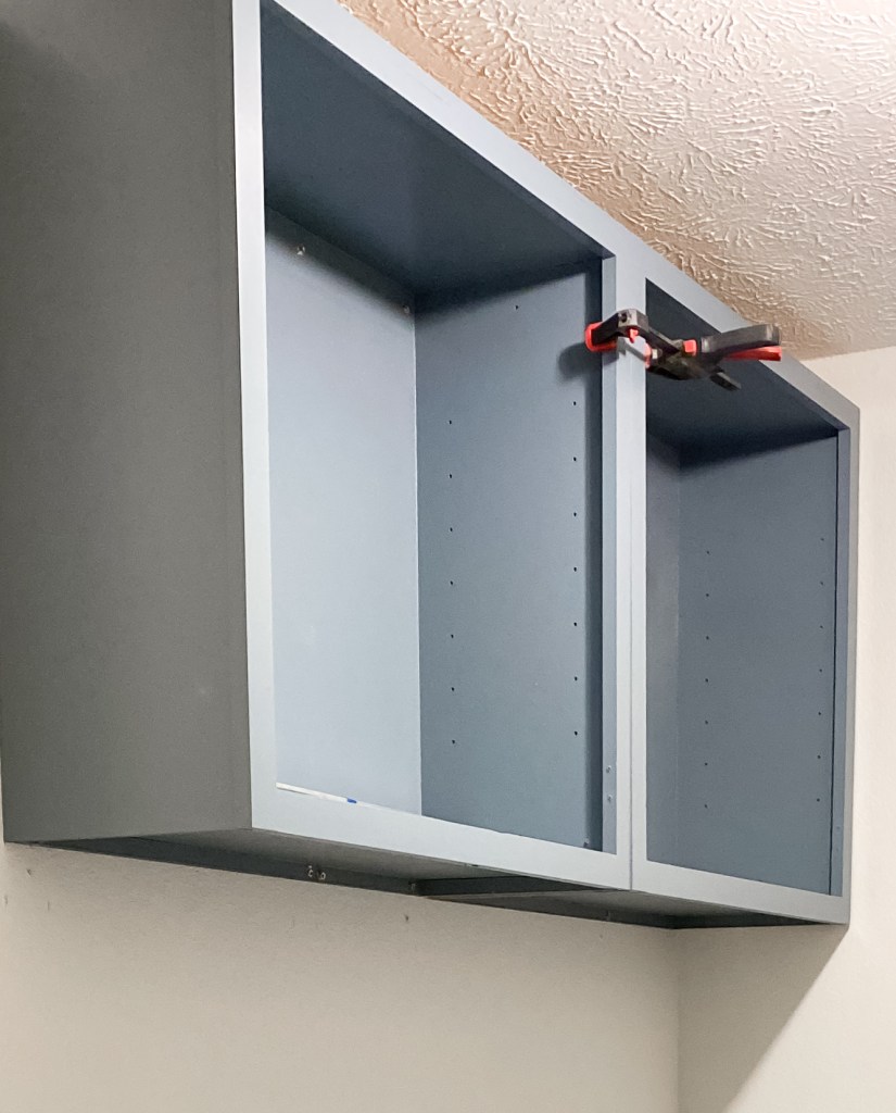 The left cabinet hit three studs while the right one only hit one, so we screwed the two cabinets together as well to give that right one some extra support. I used these awesome 3″ construction screws that are self drilling, but you could use any screw 2″ or longer.