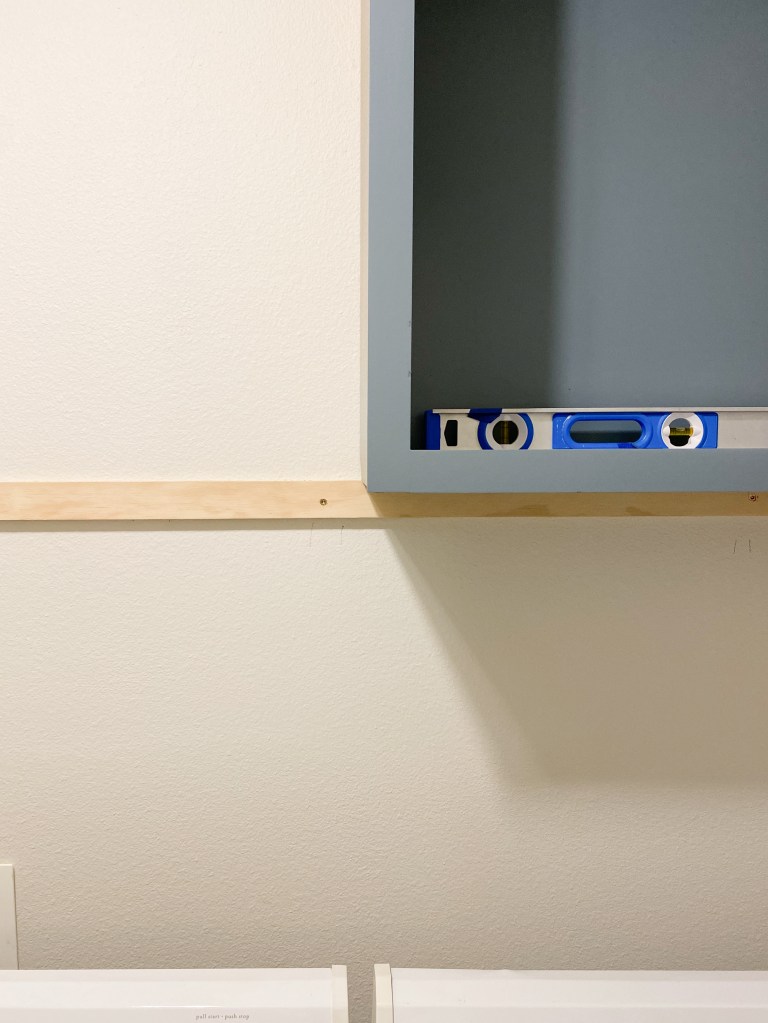 Hanging the wall cabinets was actually much simpler than I expected. I marked where I wanted the bottom cabinet to fall and also where all the studs are. Then I screwed a scrap piece of 3/4″ plywood on the wall as my ledger board. I would recommend using a 2×4 if you have one, but I already had this scrap piece in my garage and it did the trick. You need to make sure that you screw this in nice and level. Ours actually ended up being a little off and we fixed it with some shims, but it would’ve been much easier if it had been level to start.