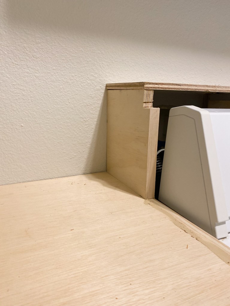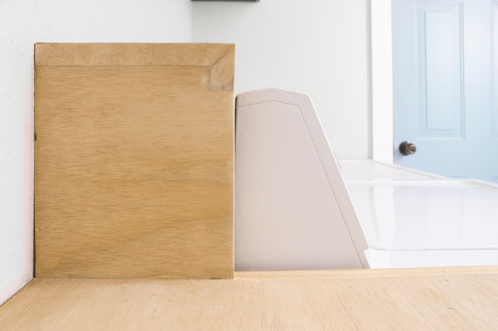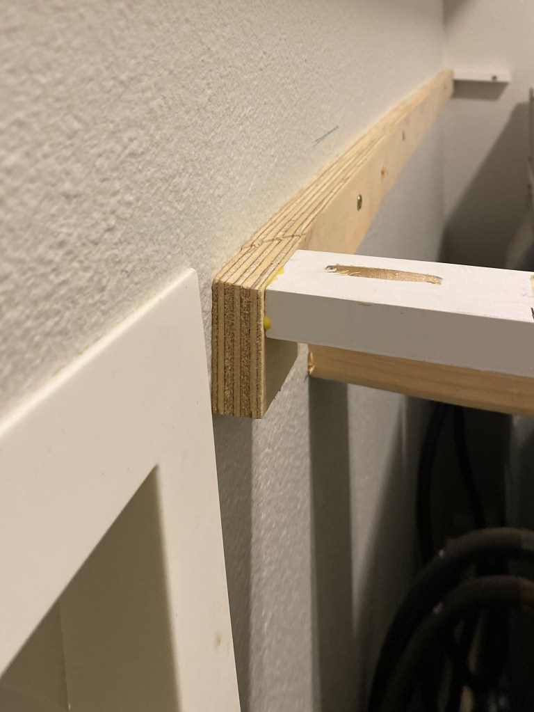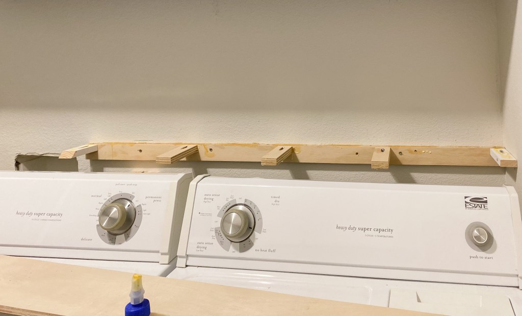 Measure how long your ledge needs to be and mark the studs in your wall. Using 3″ screws, screw the back piece into the studs, making sure that it is installed level. If your plumbing is set up like mine is, you can end your bracket a little early to avoid running anything over your water hookups. To figure out what height to install the back piece at, mark where you want the top of your ledge to sit, then subtract 1/2″ (or 3/4″ depending on the thickness of your plywood) and make a second mark below the first. The top of your back board should hit the second mark.