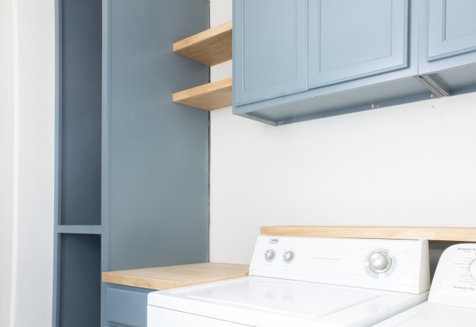 If you (1) have a top loader and (2) are looking at your laundry room feeling… meh… about it, stop what you are doing and build this ledge! It is really straightforward and quick to build, so it’s pretty instant gratification. You can also check out some other easy DIYs in this room by visiting this post.