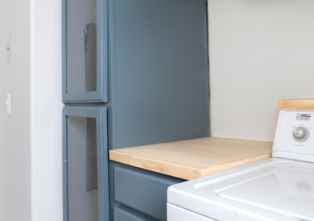 Attaching the hinges was also a lot simpler than I thought. I just made sure they were square and screwed them into the door. Then I marked where the top/bottom of the door should hit the cabinet frame (using my existing cabinets as a guide) and enlisted the help of my husband to help me hold them at the right height. I don’t know if I just got lucky, but it was as easy as screwing them into the frame and they sat perfectly level!