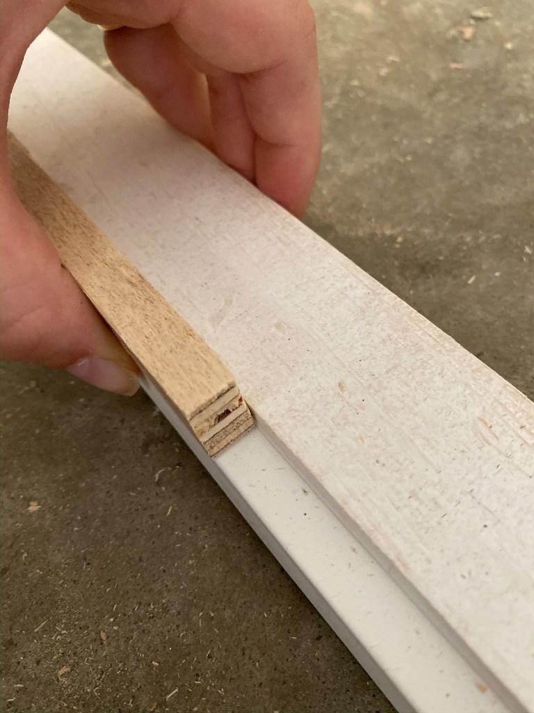 I went back to my purchased cabinets and measured the distance from the edge of the doors to the raised trim section, which is 0.375”. This meant I needed to set my lattice piece in 0.375” from the edge. To figure out my cut length for the lattice, I started by subtracting 0.375” twice from the longer 1×2 lengths (because remember, two sides). Then I cut a scrap piece of wood to 0.375” and used that as a spacer to line up the lattice.