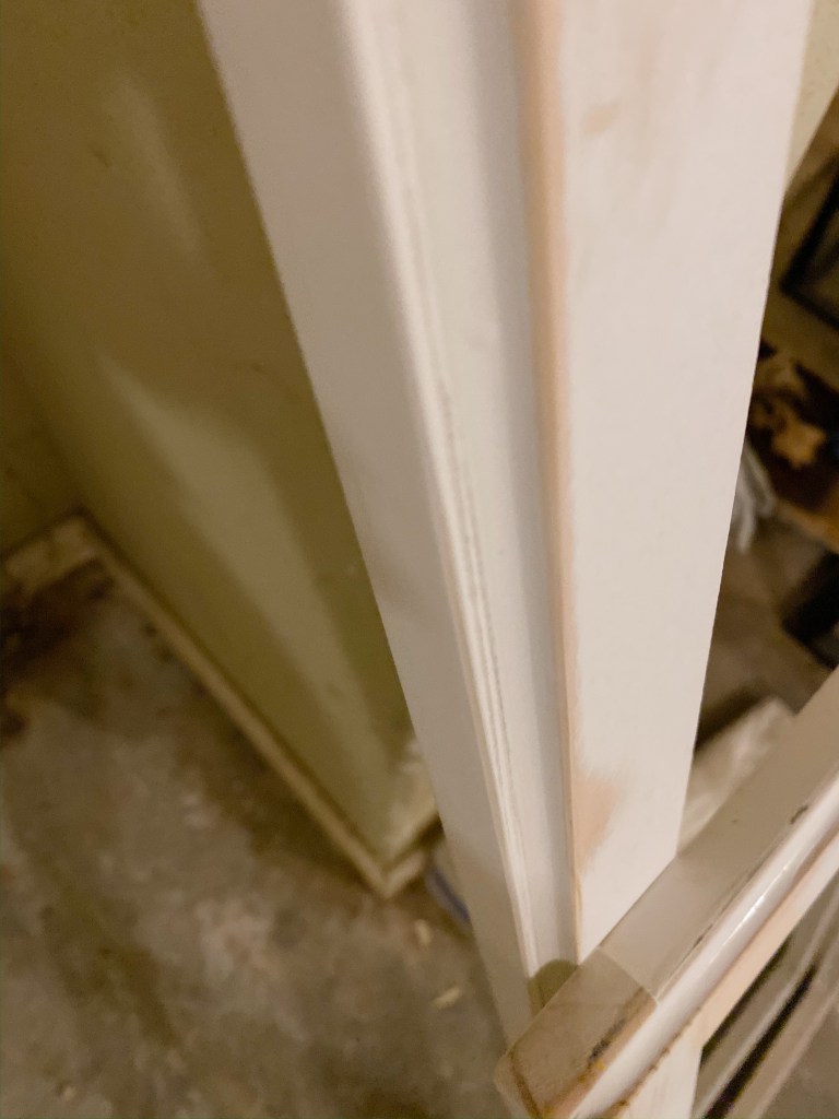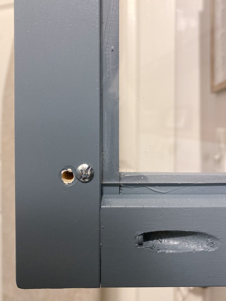 I filled all my nail holes and flat seams with wood glue. I sanded the edges down so there weren’t have any sharp corners. I caulked the seam between the lattice and the frame with a really thick bead of caulk so that it gave it a bit of a beveled look to match my existing doors have.
