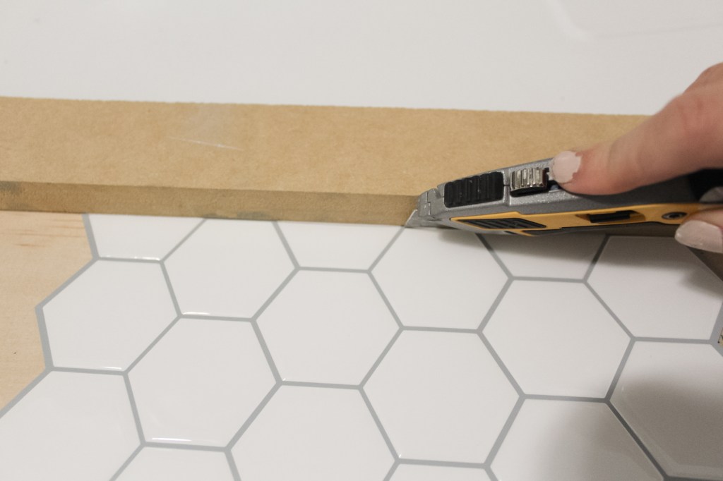 When you go to lay the next sheet, you need to overlap the “grout” lines. My biggest grievance with this product is that this outer grout line is just a hair thicker than the inner grout lines, so even when you overlap it perfectly, the line still looks a little bit thicker. Not a huge deal, but this is probably not something I would use as a permanent solution for a focal area of the home (though it could be great in a kitchen, for example, as something to tide you over until you can get something a little nicer installed).