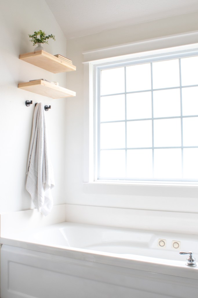 After using this bathroom for over a year with no towel hooks (see, I don’t actually have my life together haha), I finally figured out the placement and installed these for bath towels and these for our hand towels. I also built a few thin floating shelves to go over the hooks for some texture and warmth and because, well, is there a room that’s not made better by shelves? Haha.