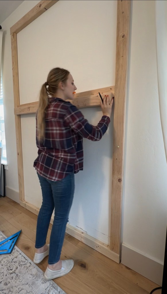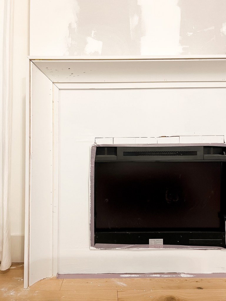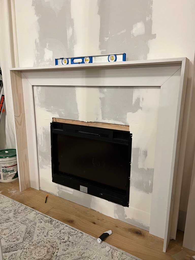 I saw Jen from Making Pretty Spaces on instagram use crown molding to build a mantel and new I wanted to incorporate that. So I built a “frame” using 1×6 preprimed pine with wood glue and a nail gun. The inner pieces just butt up against the outer pieces and then are nailed in that way. I screwed the back board into the studs of my framing for stability.
