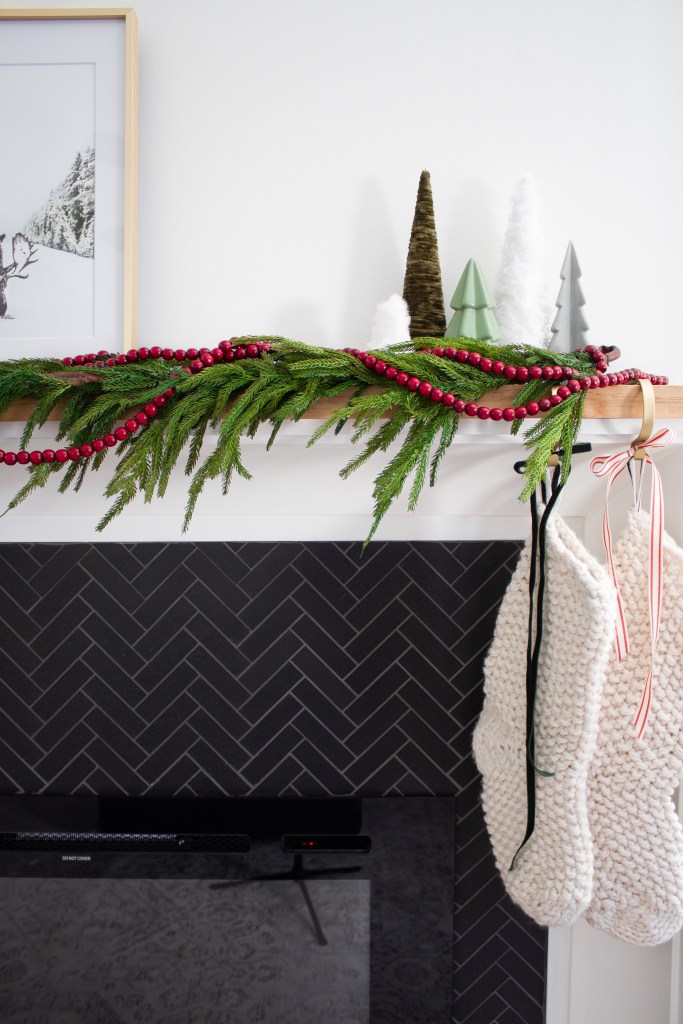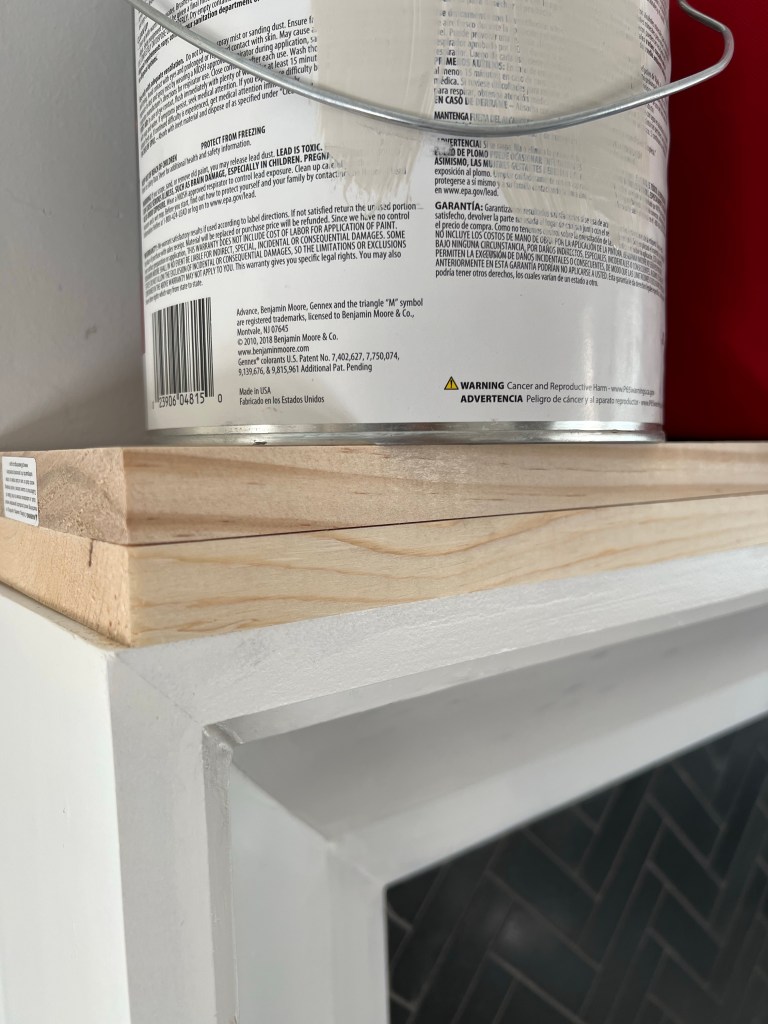 To finish everything off, I added a wood top to the mantel. I took a 1×8 pine board and nailed that on top of the mantel. Then I took a 1×8 select pine board and glued that on top of the other piece. The select pine is more expensive but absolutely worth the cost since it’s the piece you can see. The regular pine is fine to use as the base piece since it’s totally buried. Then I wrapped the whole thing in 1×2 select pine so it looks like one thick piece of wood, but is more cost effective.