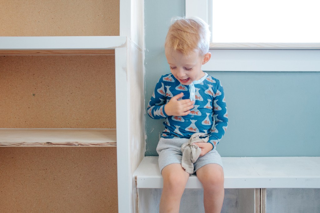 After I’ve primed and painted I’ll work on the doors for the cabinets, the bench cushion, his accent wall (which, by the way, I am super pumped for), and then once I decorate I think we’ll be done! I know I’m so excited to have this room finished and Elliott is too! It’s been fun to watch his excitement towards helping create his room.