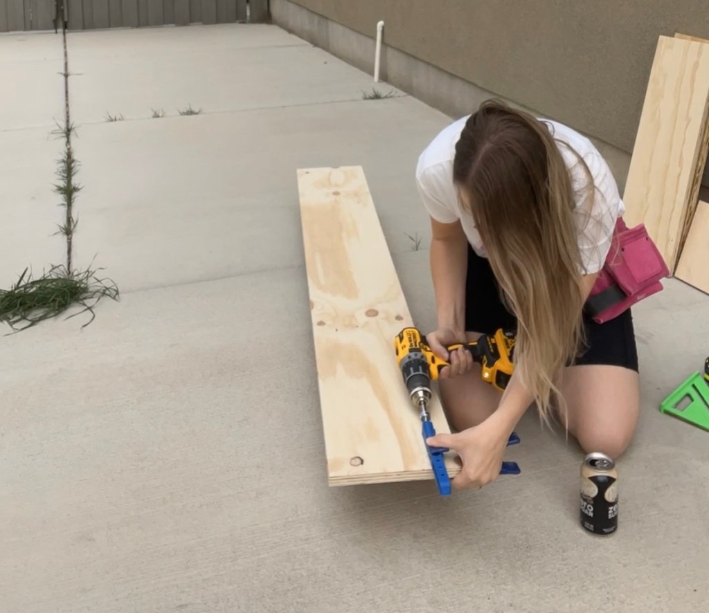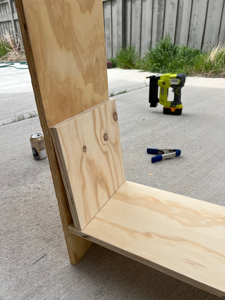 Using the speed square, make sure the sides are perfectly perpendicular to the shelf and throw a couple Brad nails in using the nail gun to hold everything together. After it feels secure, lay it down and screw the pieces together. Double check squareness with your speed square as you go.
