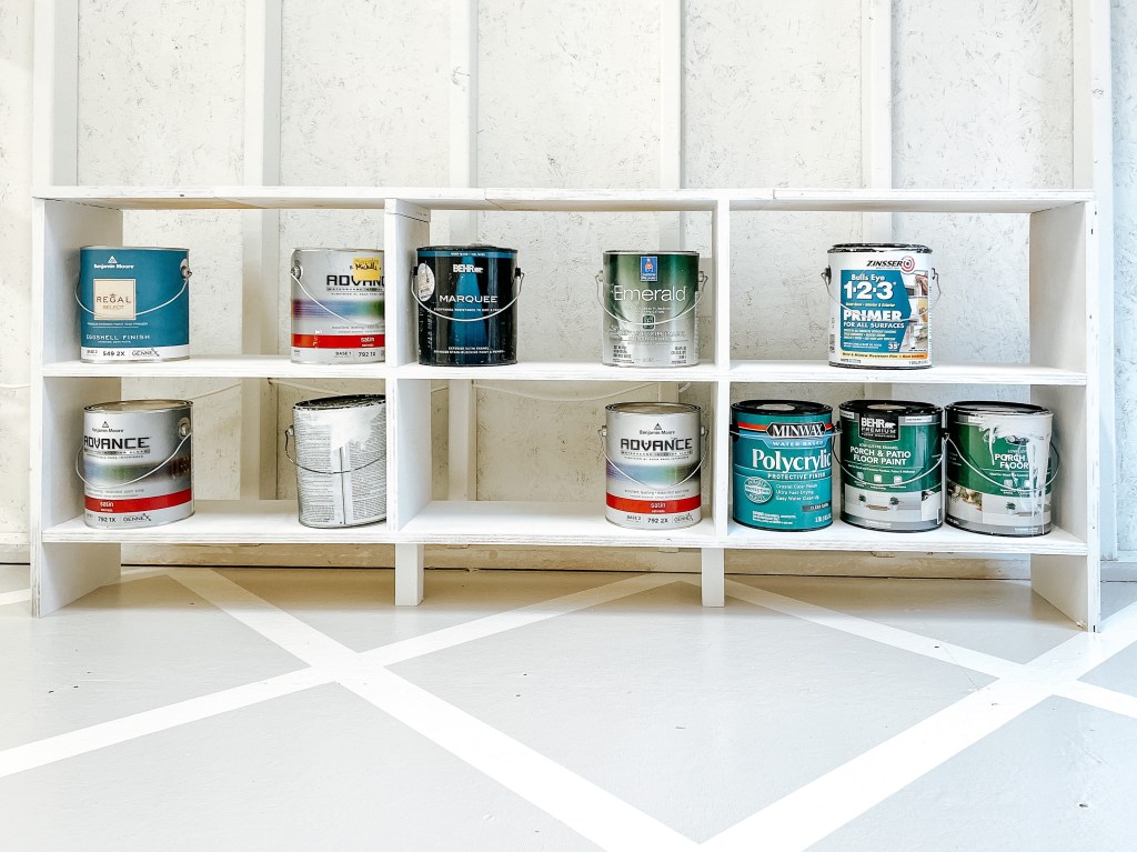 Now you can prime and paint it if you want! You don’t have to, but why not? Everyone wants a bougie paint can storage shelf, right? If you do paint it, I highly recommend spraying it. This is my favorite paint sprayer! It’s inexpensive and saves so much time.