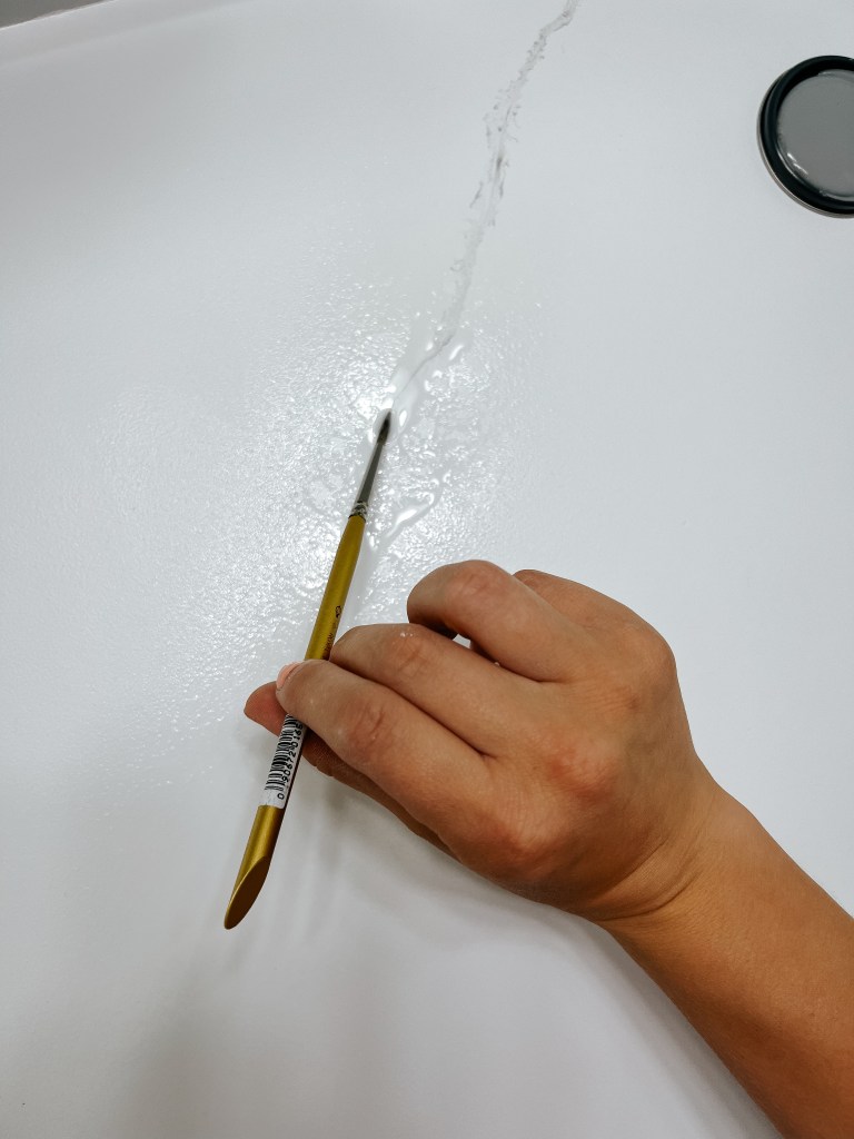 Once it’s nice and white, it’s veining time! This is the most nerve wracking part of the whole process but it’s not as difficult as it seems. I promise. Search on Pinterest and google to find a few examples of veining that you like and then use those to loosely guide you. I recommend lightly spraying the area you’re working on before and after you add a vein. Using the small brush, get a little gray paint and twirl the brush as you drag it across the surface to create an organic looking line. Then spray again and use one of the bigger brushes to kind of dab it so that it’s not so harsh. If you don’t like a vein, just wipe it off before it dries. Easy peasy. Have fun with it!