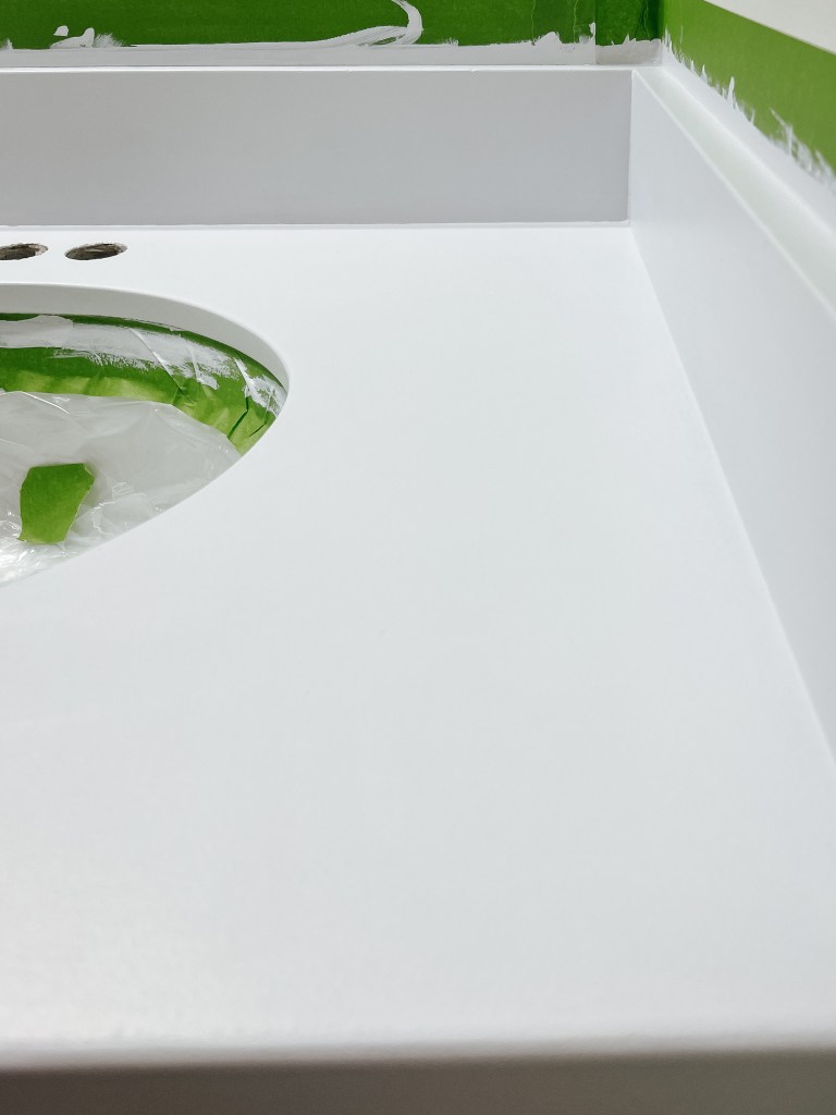 Everything – like, everything – needs to be taped off. The epoxy self levels by running off the edge of the counter, so use the plastic drapes in the kit to protect all your stuff, including the sink. I taped about 1/8″ away from the counter so that the tape didn’t get trapped in the epoxy. On the bottom edge of the counter, I taped a small 1/8″ lip which gives the epoxy had a spot to pool so that it can build up on the edge instead of just totally running off.