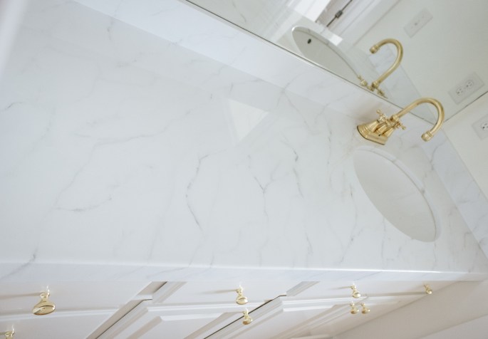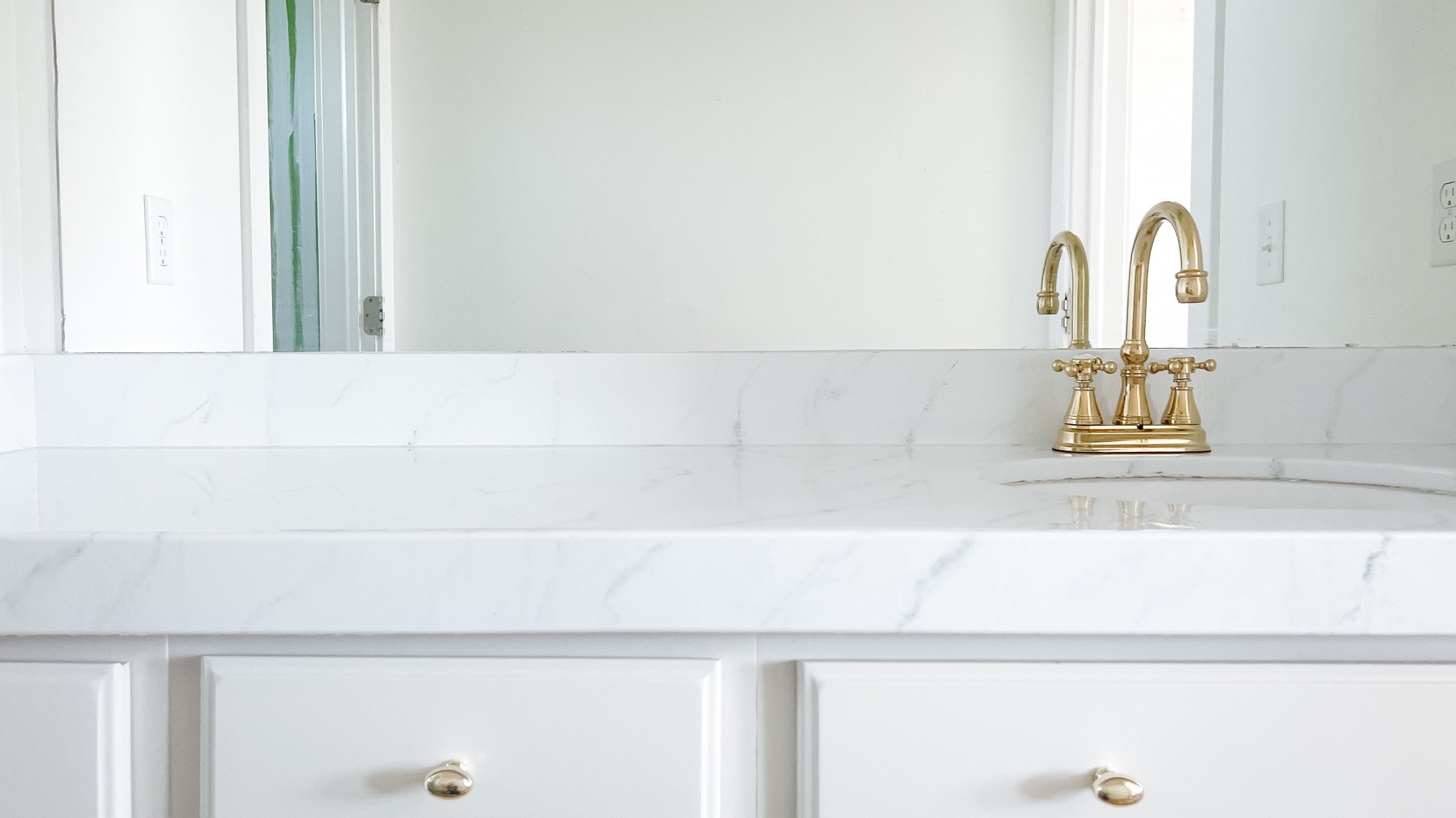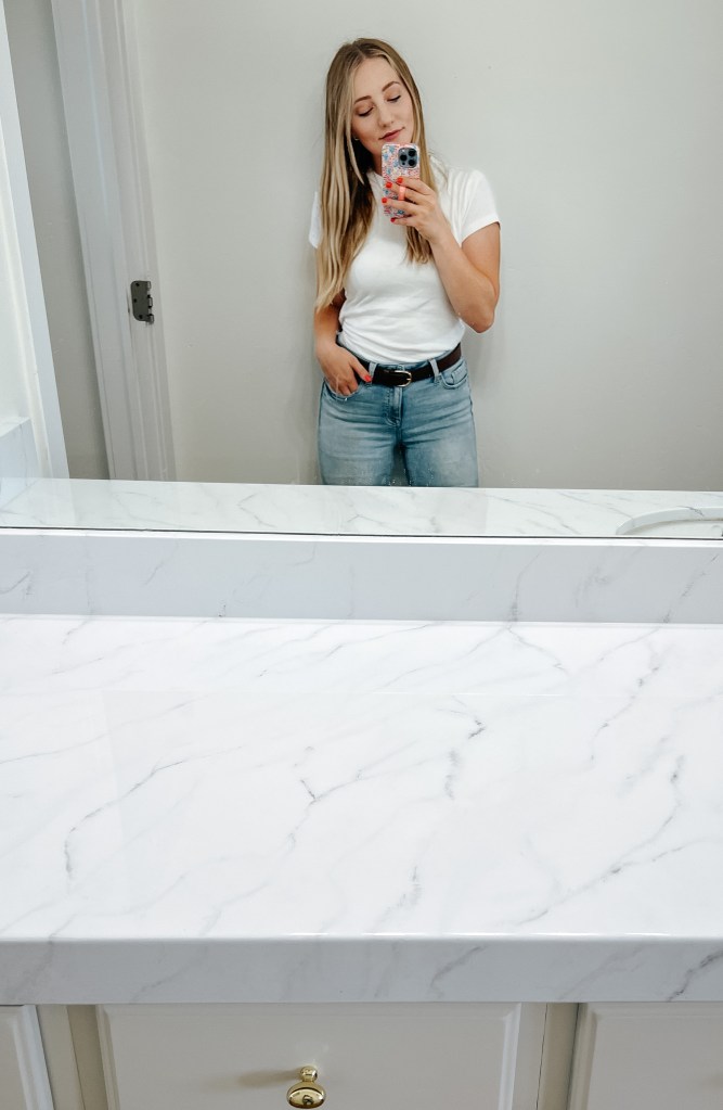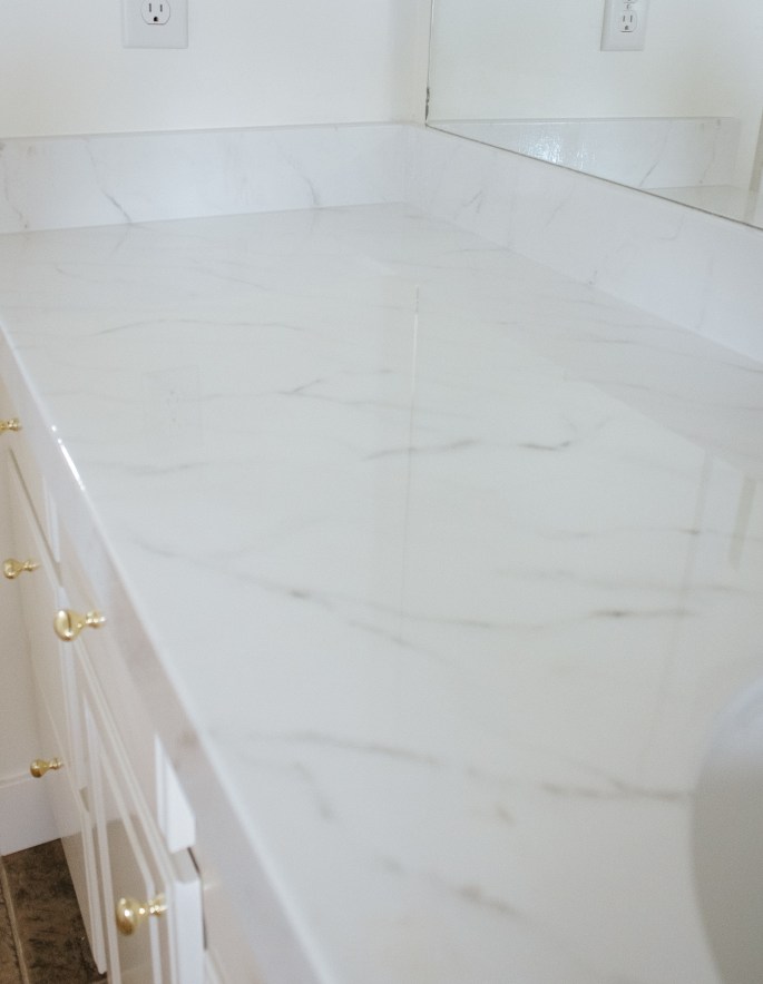 So what do you think? Did I get that faux marble look? Would you do this on your counters? I’d love to hear your thoughts below. If you want to watch all the behind the scenes of this bathroom makeover, be sure to follow me over on Instagram!