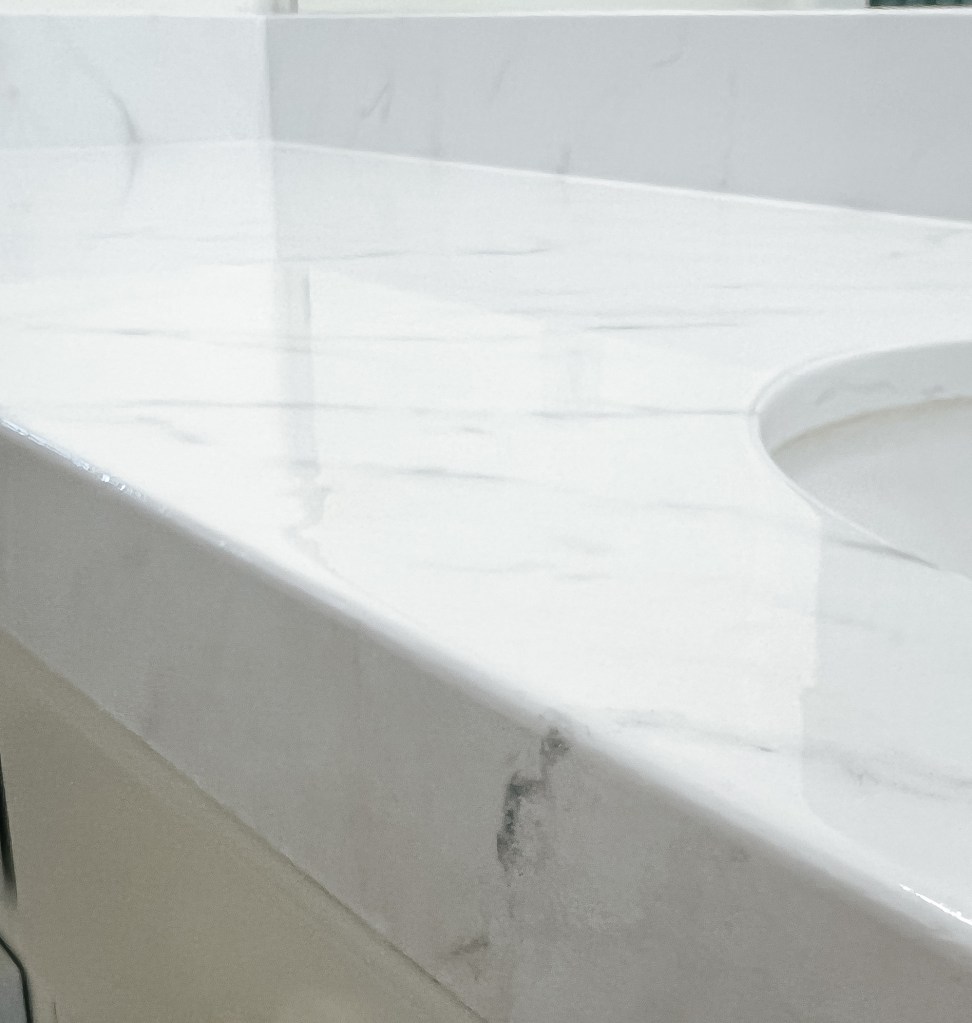 It’s really hard to capture through the camera, but if you look at the reflection you can see it’s not perfectly smooth right in front of the sink