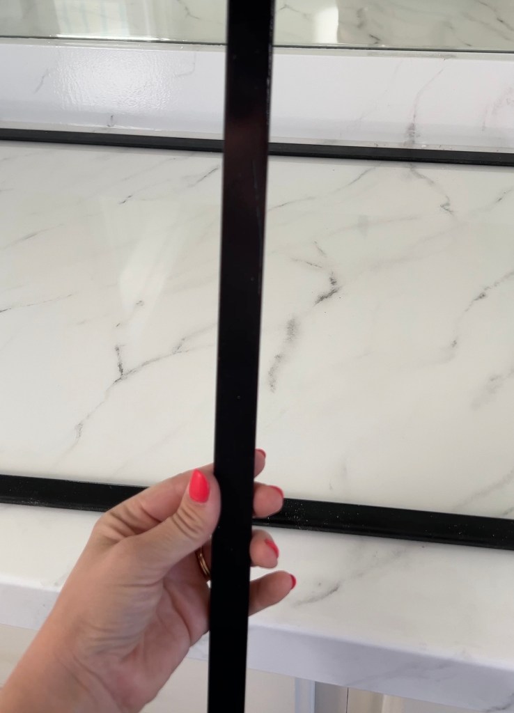 The glue that I used dries white, which meant I had to be careful with where I put it. Originally, I zig zagged it down the piece and put it up, but I could see the glue through the mirror. So I quickly pulled it off and scraped all the glue on it. Instead of a zig zag pattern, I ran the bead of glue close to the outside edge. That worked really well, I can’t see any of the glue reflecting into the mirror because it’s far enough away from the inside edge. *BUT if I were to do this again, I would chose a clear glue. I’d still run it along the outer edge, but I wouldn’t have to be as exact.