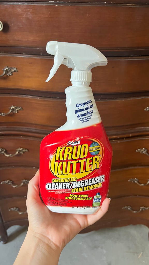Clean your piece really well. Get all the nasty dirt and grime (that you probably don’t even notice ) off with Krud Kutter. Hands down my favorite thing to clean furniture I’m about to paint with. Don’t use this for regular cleaning because it can mess with the finish!