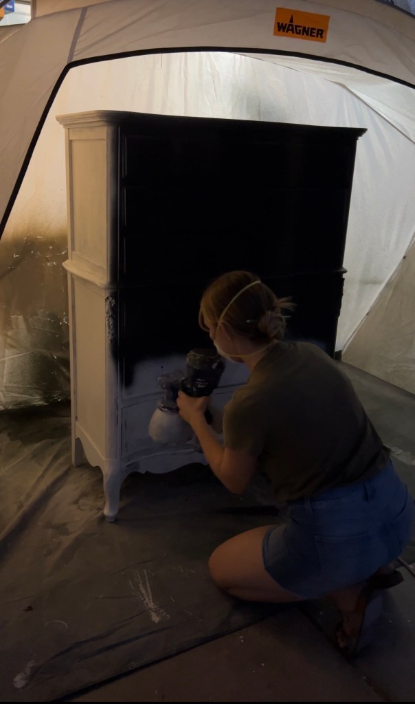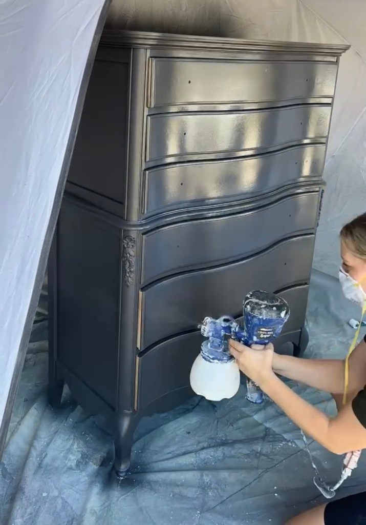 If you’re using another type of paint, you need to apply a top coat. Do this the same way you painted, by spraying! Top coats can be fussy, so spraying them is a game changer. Such a good finish! This is my favorite top coat. I used it on our dining room chairs three years ago and one of them has one scratch that happened in the move. They have held up so well! Do two to three coats and be sure to sand (and wipe) in between coats.