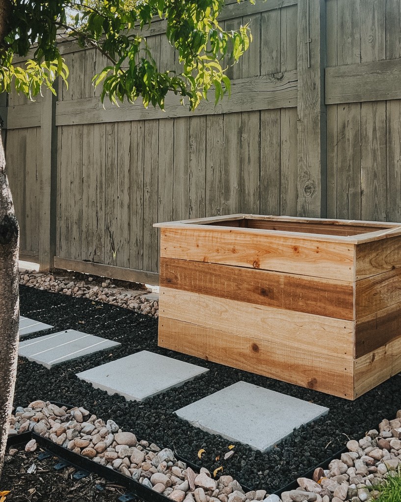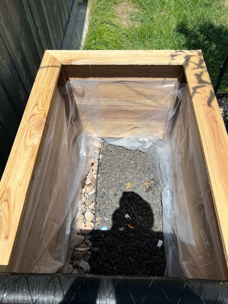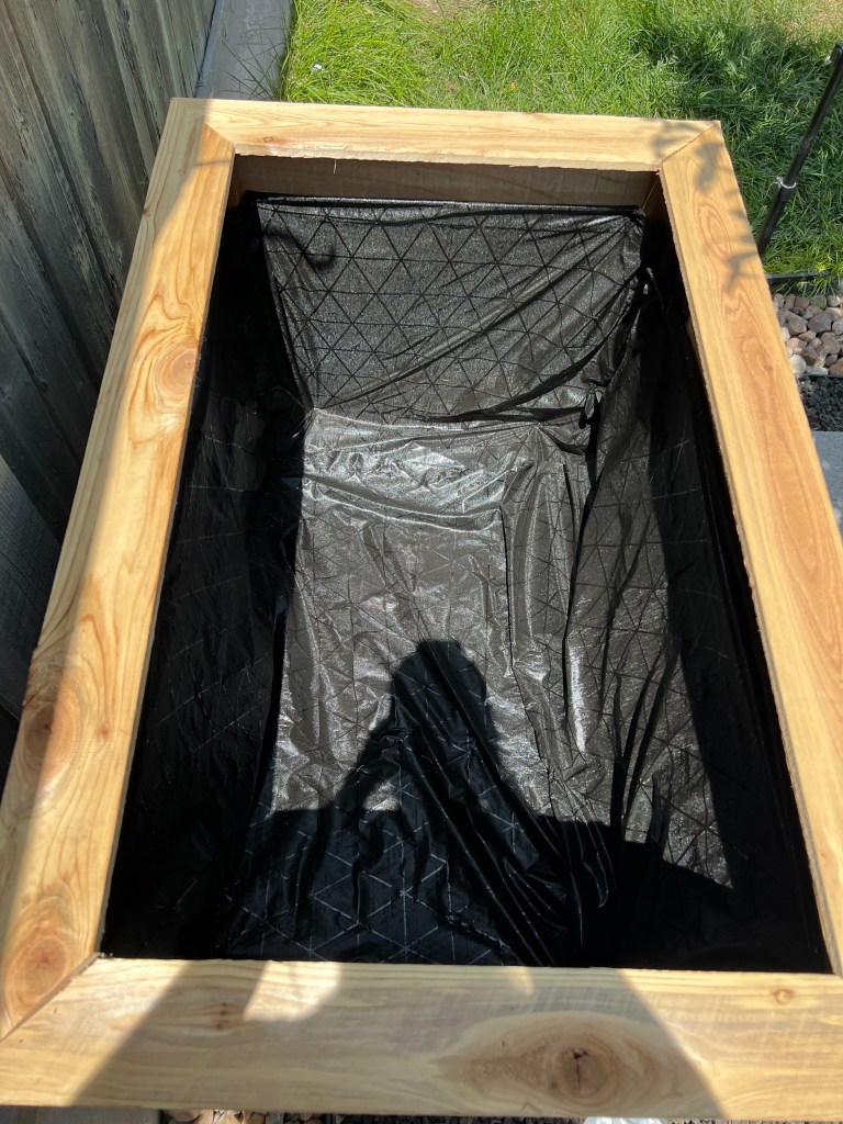 I lined my box first with plastic sheeting to try and help keep the soil moisture off of the wood. It is exterior rated wood (duh, it’s for a fence) but I still want to prolong my boxes’ lives for as long as I can. I stapled the sheeting on just above the first slat line and made sure that it wasn’t lining the bottom because that would mess with drainage. Then I stapled on landscape fabric, which I made sure to line the bottom with! Its job is to hold in the dirt, so I tried to make sure I didn’t have any cracks for the dirt to seep out of. I took this about 1” above where I stapled the sheeting.