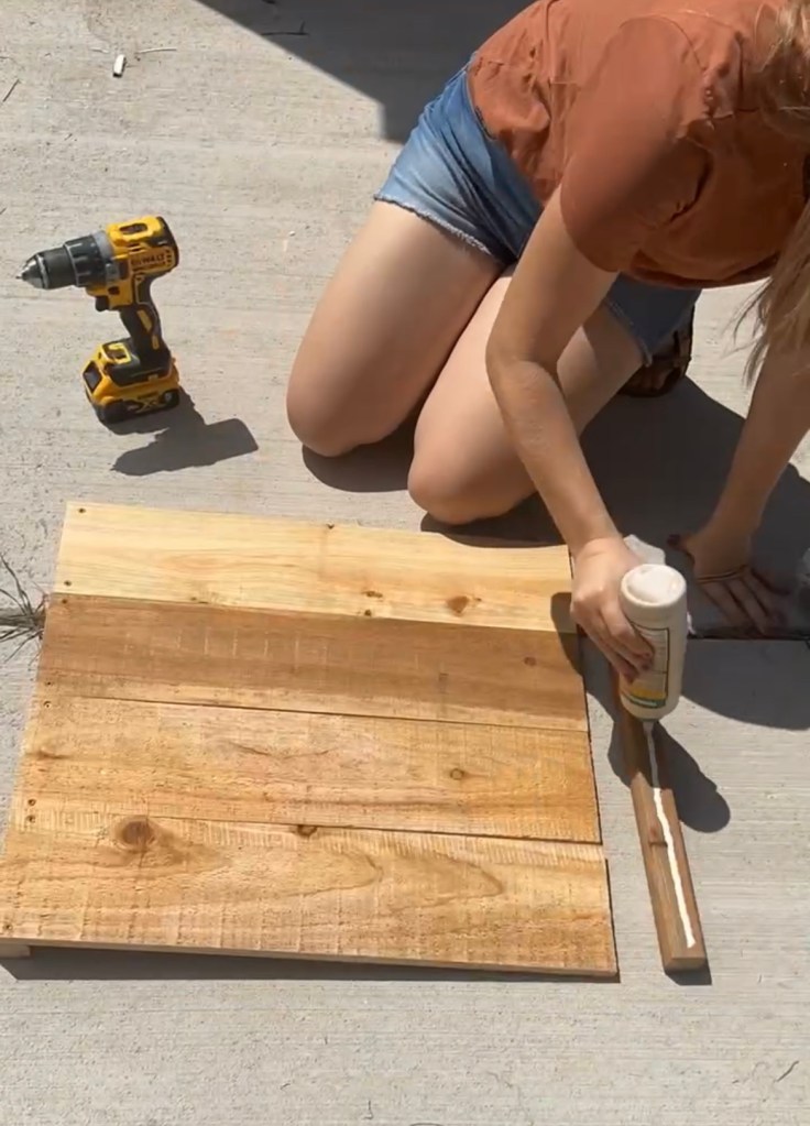 Lay out two of your 2x2s and apply a bead of glue down one of them. Then line up four of the 24” boards and screw them on, propping them up with the second 2×2 to make sure they’re laying flat.