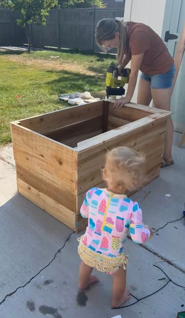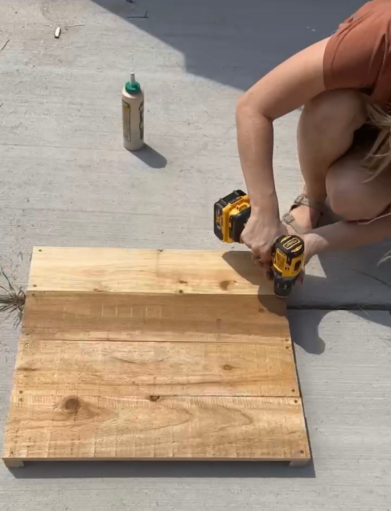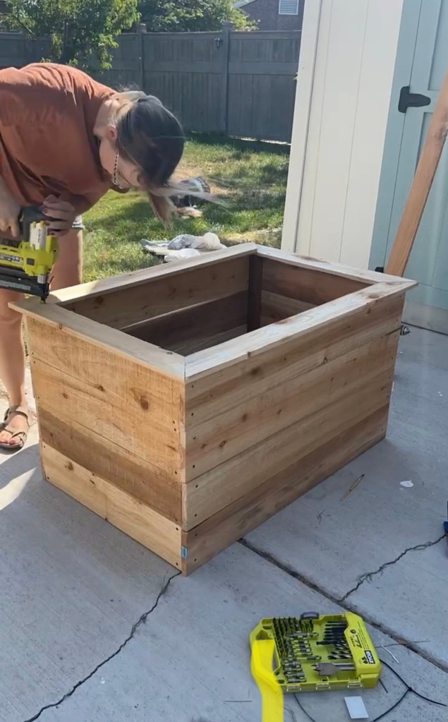 Screw four front boards onto the first side panel, then attach the second one. Grab your remaining four 40” boards and attach them to the back.