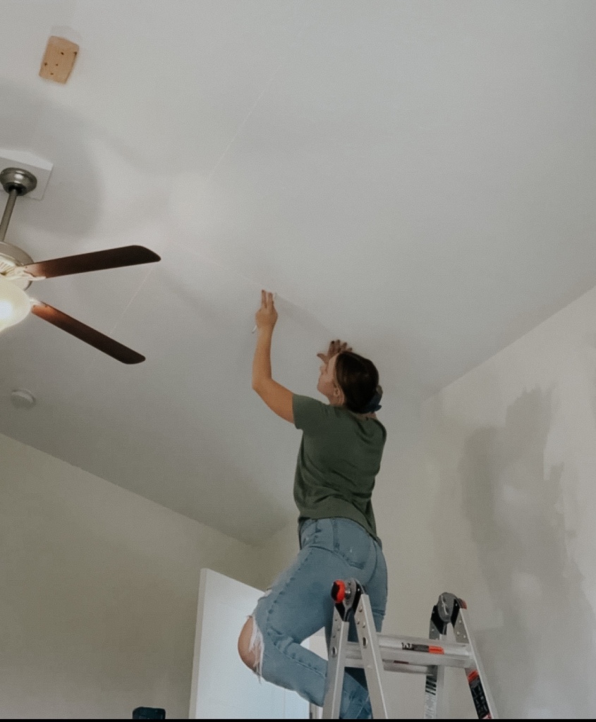 I marked my desired distance from the wall in two spots and then projected my laser level onto the ceiling helped me mark straight lines between those two points.