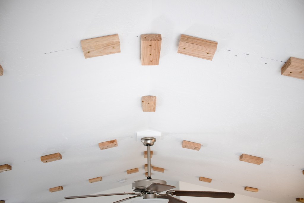 To install the pine boards, start with two 1x4s. Cut them down to the right size. If you have a middle beam like I do, be sure to do that one first! With the middle beam I didn’t need to miter any of my cuts, but I did with the others. So if you have a vaulted ceilings, find the angle using an angle finder or a folded piece of paper.