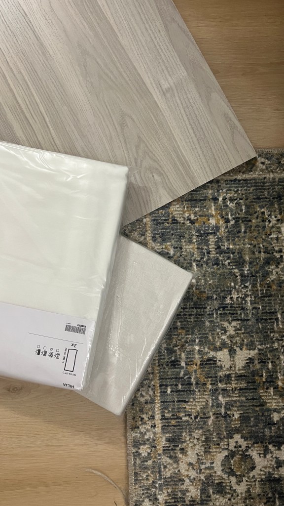 Since these curtains came all folded up, I had to iron them out – the worst part of the whole project! You can try throwing them in the dryer to speed things up. That worked with the fabric I used when I built the headboard, but didn’t do anything to help the wrinkles on the new fabric.