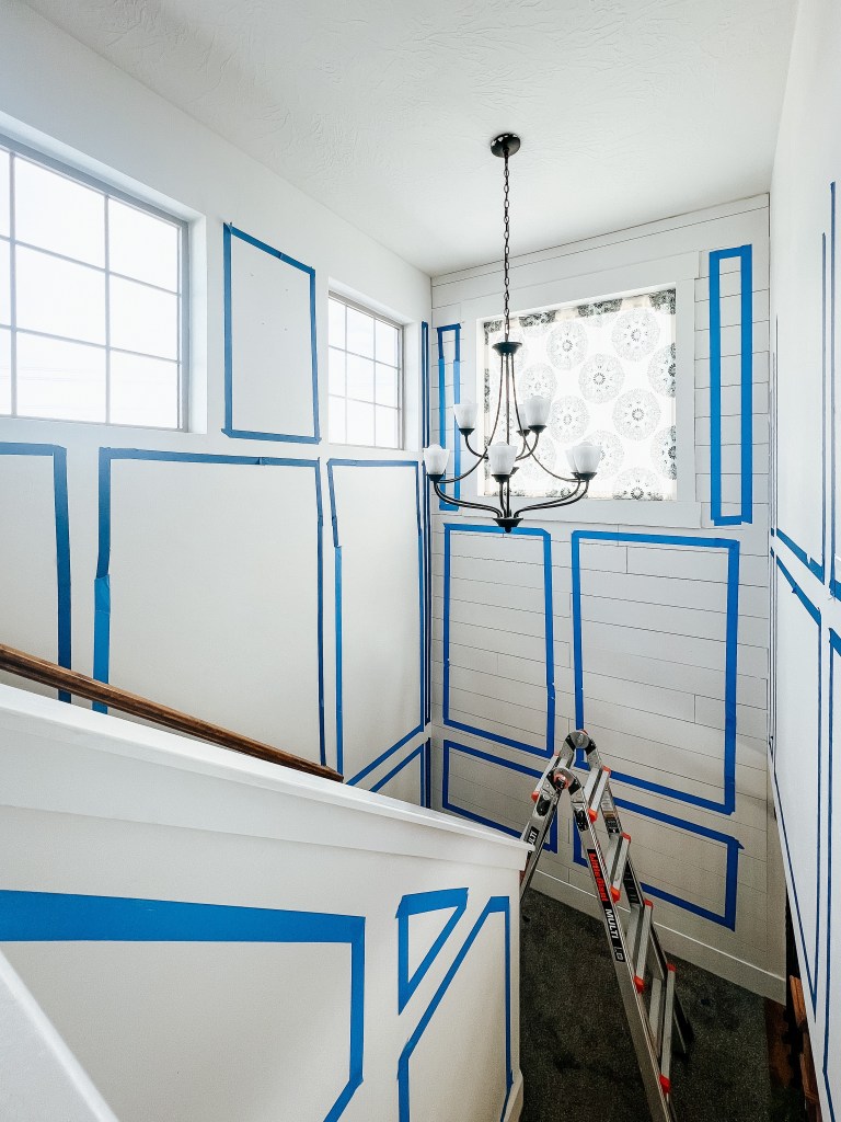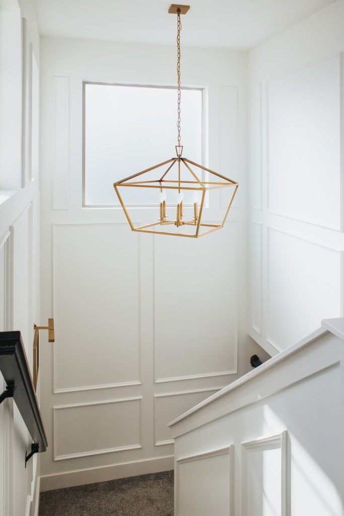 Anyway… adding this wall moulding to the stairs totally transformed the look of not only them, but really of the whole house! You can see the stairs right as you walk in the front door and from pretty much everywhere on the main floor. Before, they were nothing special with some badly done shiplap, a curtain pattern that wasn’t really me, and a builder’s grade light fixture.