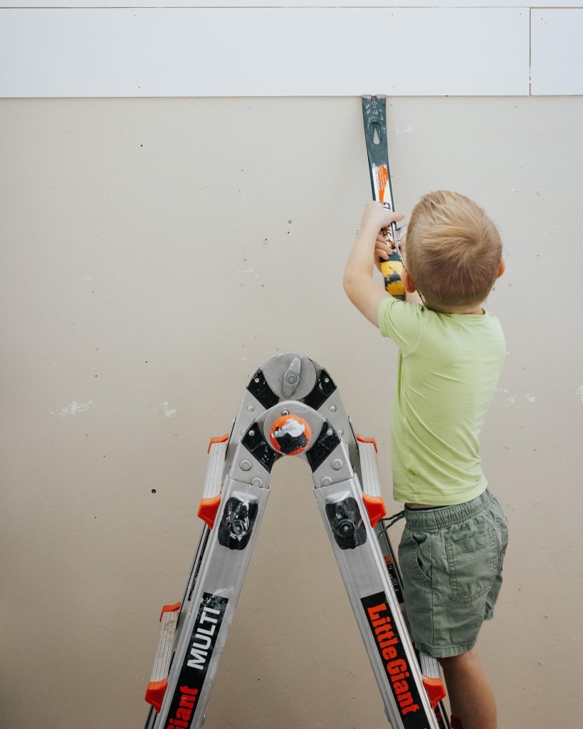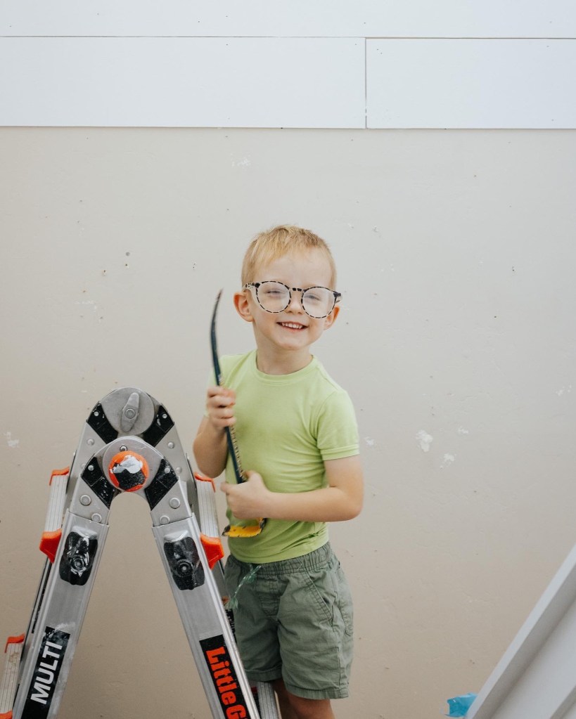 After I got the layout solidified, I had to do a bit of demo. My four-year-old helped be take down the shiplap that was here before. There were so many problems with it including boards cut to uneven widths, a bad paint job, and boards popping off the walls. Some of that would have been fixable, but there’s no saving wonky cut boards. Plus, I didn’t want shiplap there so we took it out! Then we filled approximately 8,000,000 nail holes and put some primer up to help cover the brown when it came time to paint.