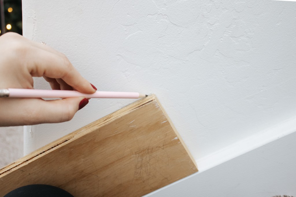 Once I had a piece cut to the correct length with miters on both ends I nailed it to the wall. I lined it up to my corner mark and put one nail in, then lined it up to the other corner and nailed it in. I also used the level to make sure everything was straight! An important note though : if you are adding a board parallel to a corner, ceiling, baseboard, etc., the spacing between the trim piece and the wall is more important than it actually being level. It could be perfectly level but if the corner of your wall isn’t level, it’s going to look off. So line your spacer block up with the wall as your primary way of spacing on spots like that!