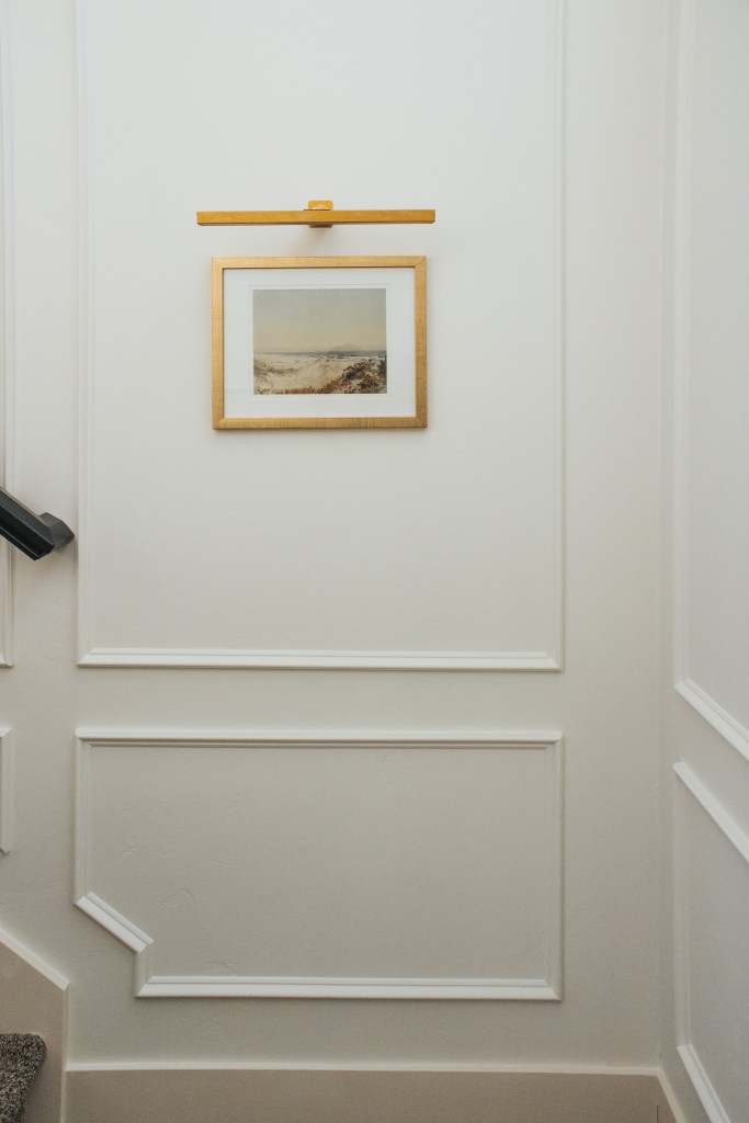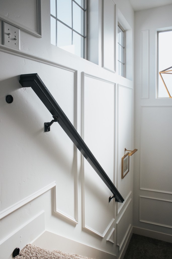 I took down the shiplap with the help of my eager four-year-old, replaced the curtain with a privacy film (more on that below), installed wall moulding, then last minute painted the banister and bam! The staircase of my dreams was born.