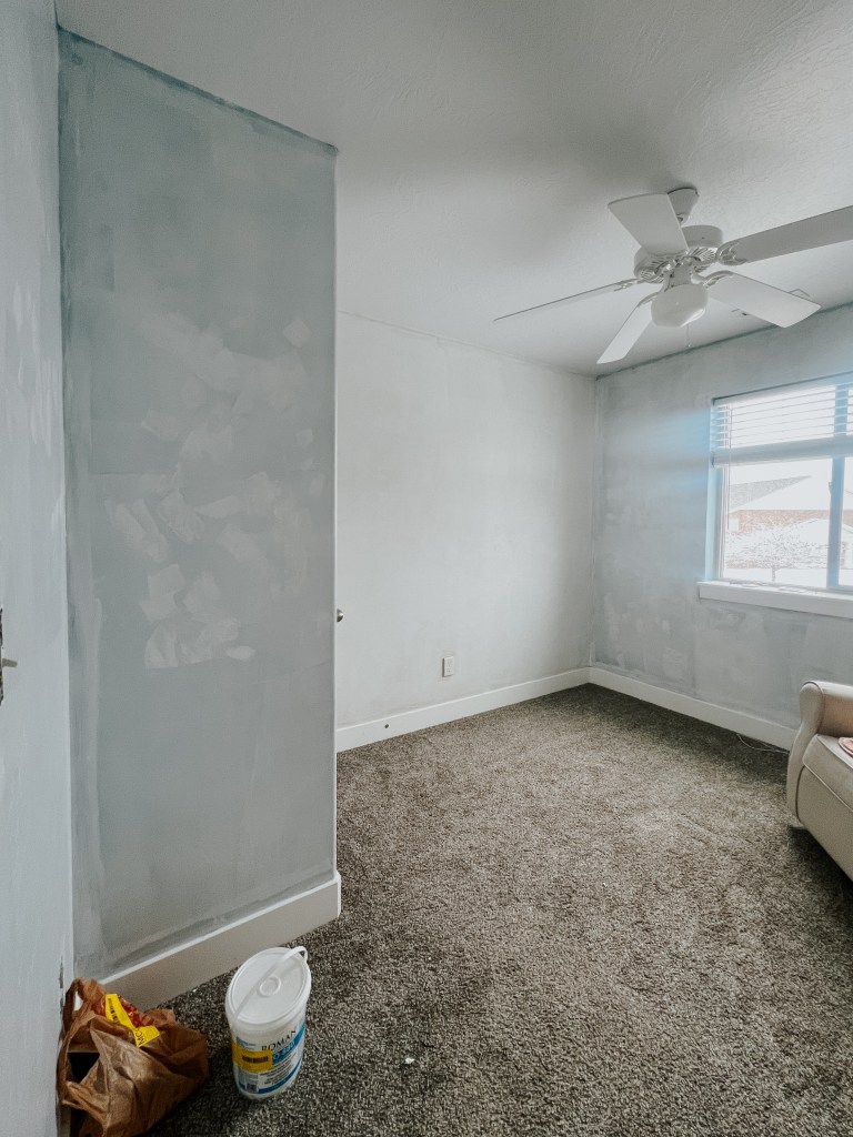 After removing a faux brick accent wall in here, I was left with one light brown and three blue walls. A good thing to keep in mind when you’re wallpapering is how see through is your paper and what are any imperfect seams going to look like? Because if you are trying to put white wallpaper on top of a black wall, it may not turn out exactly as you had envisioned it.