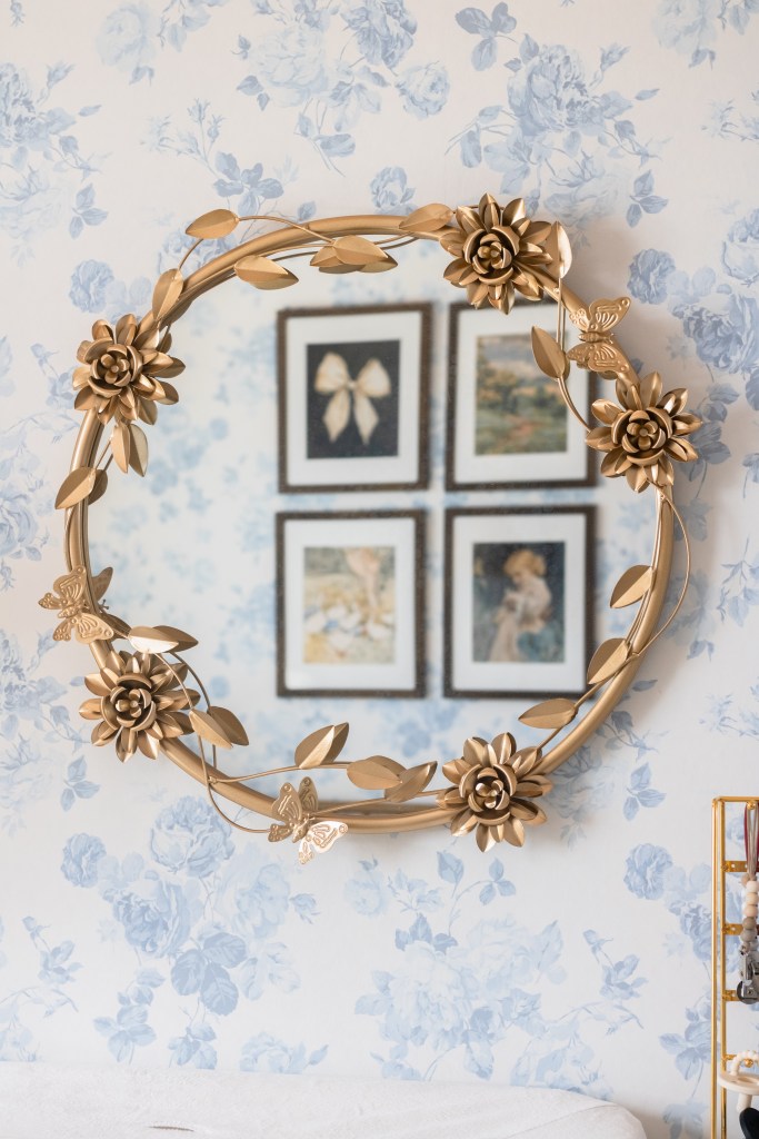 Since the vibe I was going for was whimsical vintage, I added this vintage style gold crib (I actually used the same one, just in white, in Theia’s room) and some vintage artwork in beautiful (but affordable) walnut frames.